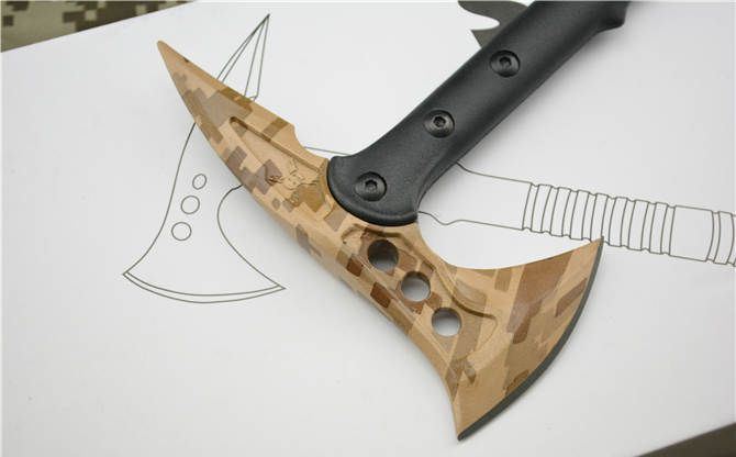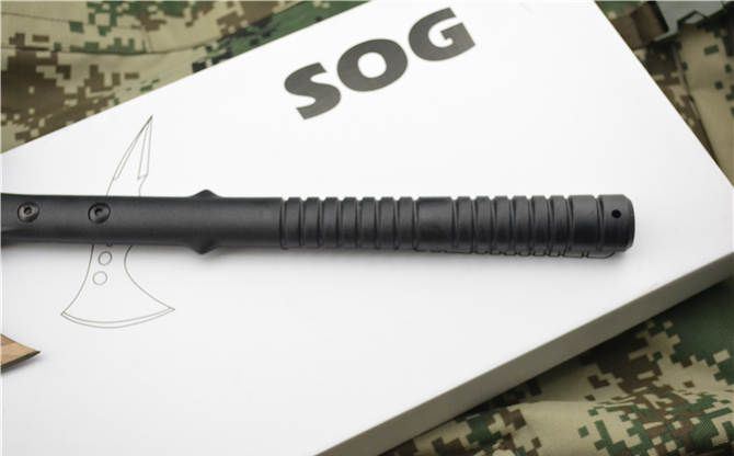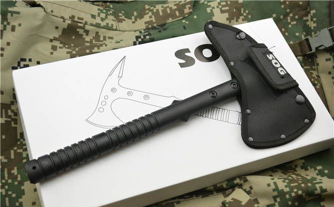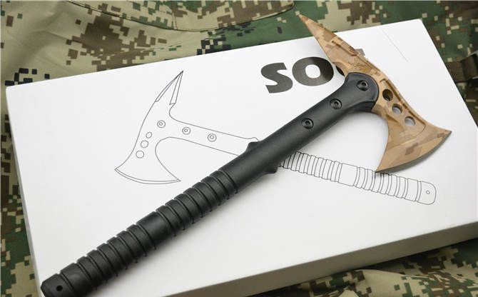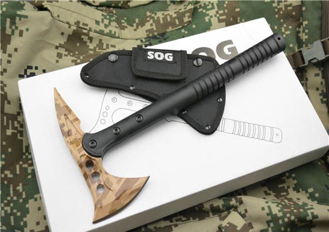 迷彩SOG战斧 全长:39CM 刃长:19.8CM 柄长:37CM 刃厚:2.2CM 刃宽:9.5CM 刃材:精铸钢,全刃开锋 柄材:尼龙+玻璃纤维 硬度:56-57 净重:625克 毛重:940克(含尼龙袋、盒子) 表面:迷彩 刀套:加厚尼龙(可绑在腰间)