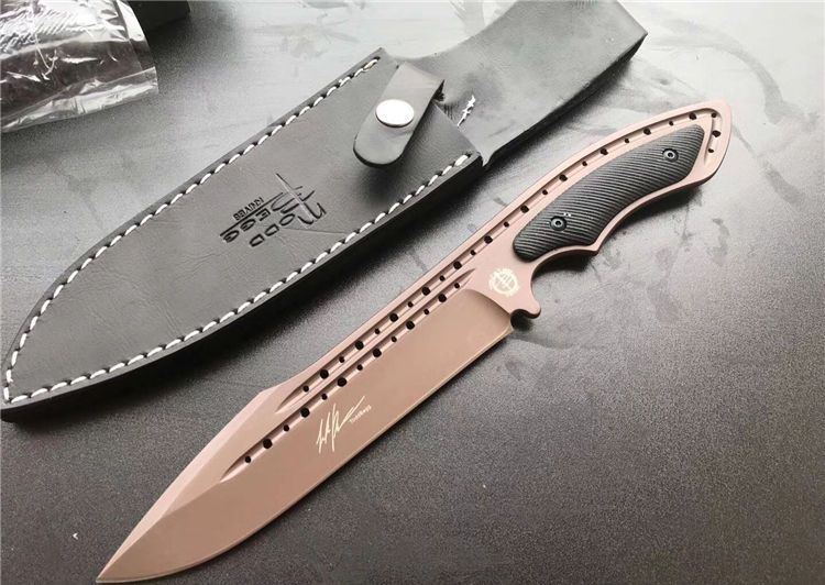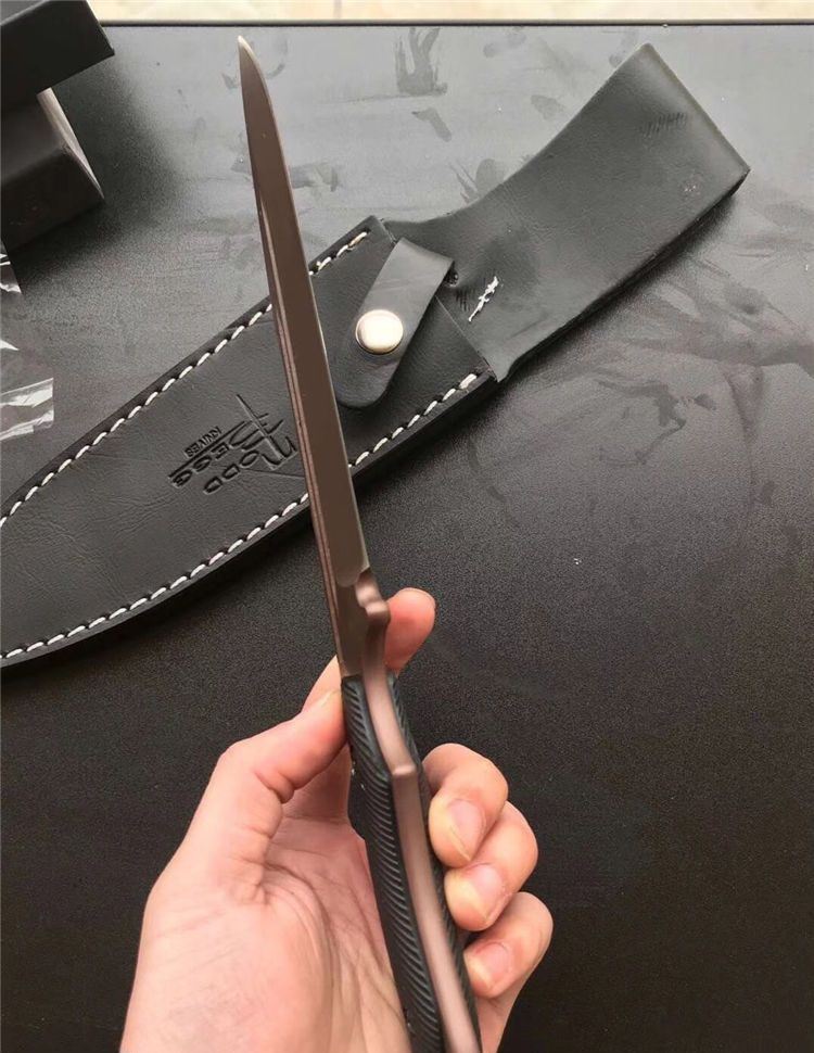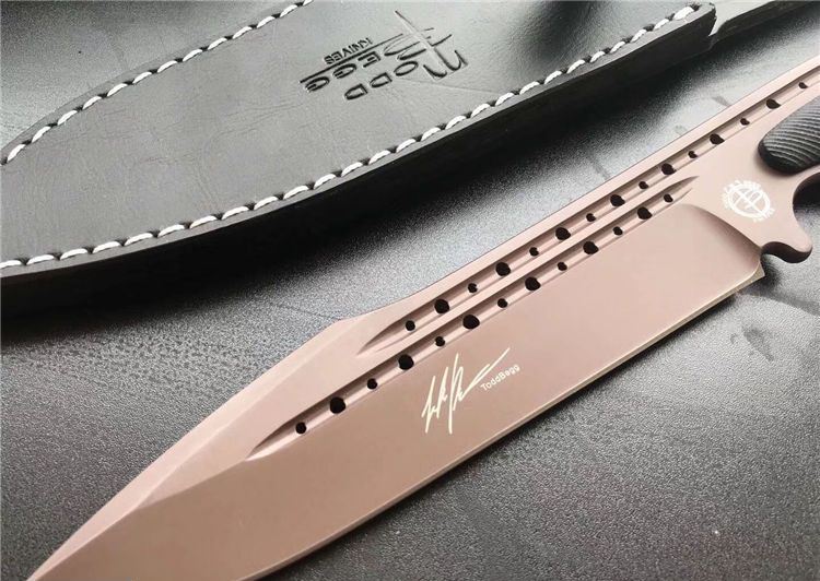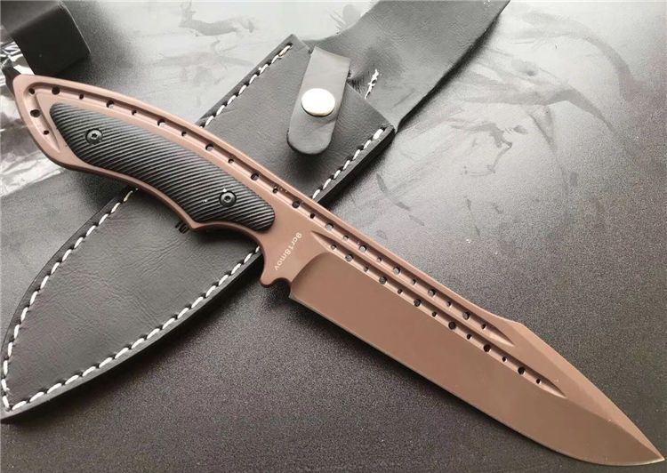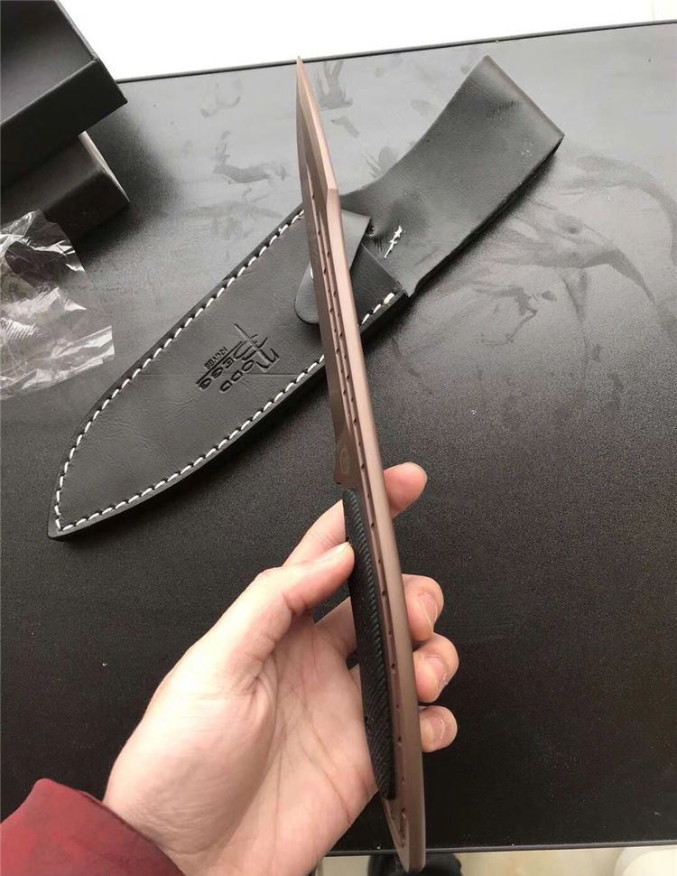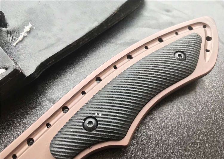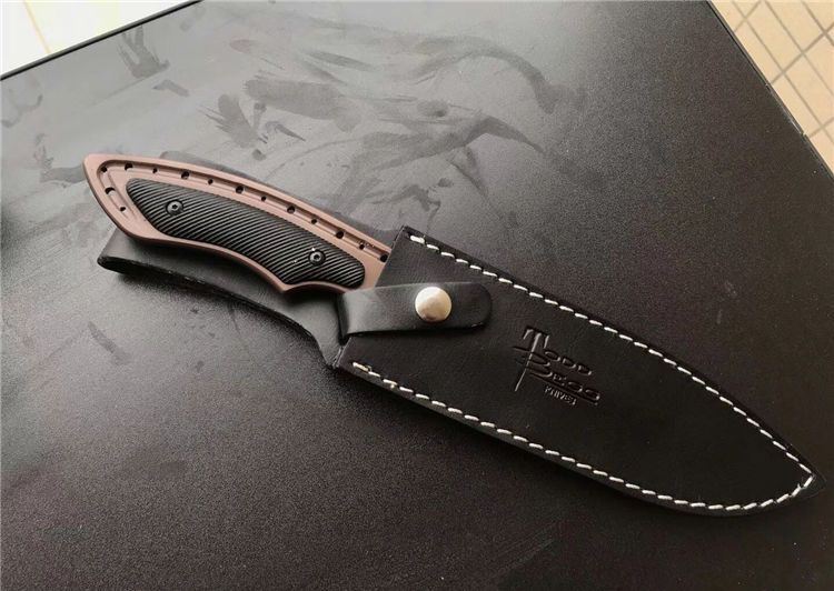 托德贝格.电鳗手工版咖啡色 全 长:31.8mm 刃 长:17mm 刃 宽:4.3mm 刃 厚:6mm 刃 材:9cr18mov 重 量:380g(不含包装) 硬 度:59HRC 表 面:钛镀 柄 材:钢一体柄+黑色G10 其 他:配头层牛皮套