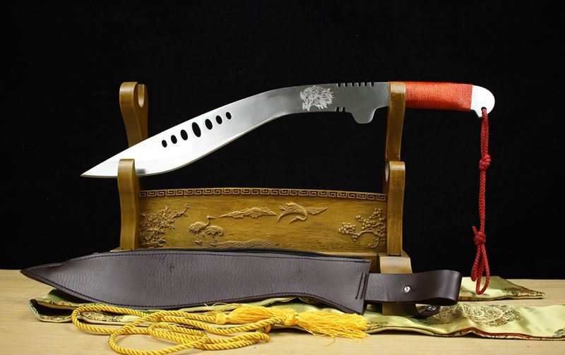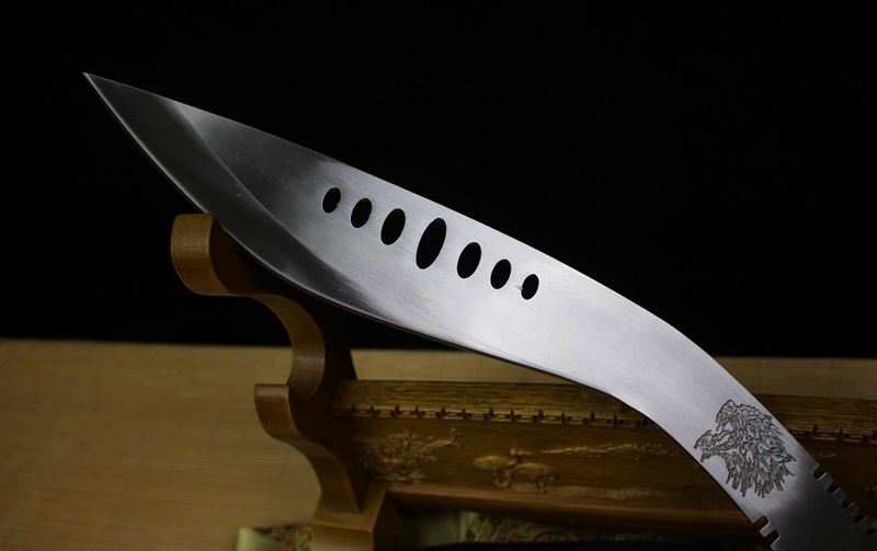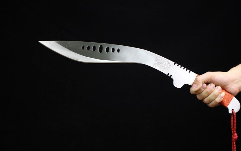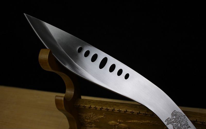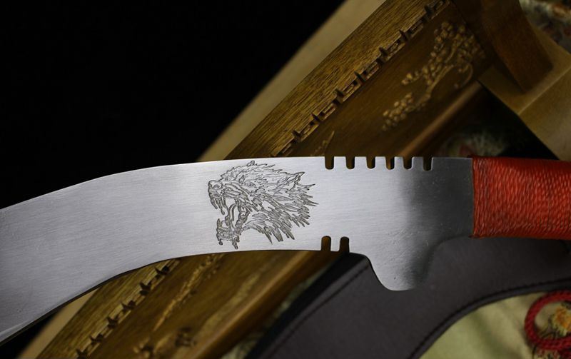 老狼七眼狗腿刀 全长:54cm 刃长:28cm 柄长:10cm 刃厚:0.75cm 重量:1KG 刃材:锰钢,全开封可砍铁砍钢筋,户外生存把玩必备佳品