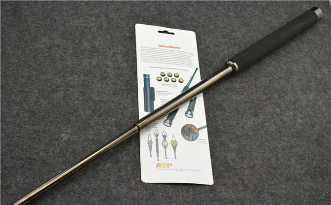 棍体材料:高强度合金钢, 硬度大概58HRC(经测试,能吊起一辆汽车以上的重量) 棍把材料:黑色乙烯基合成(防滑材质,不会因流汗潮湿而滑手) 收缩长:23.8 CM (便携隐蔽) 甩出长:63.0 CM (常用长度) 净重:660克 表面: 黑钛 原版双面吸卡包装 其他性能:钢卡式,专门在接口处精密处理,处理后甩出锁定牢靠, 收回时,朝地面垂直一磕就回去了。