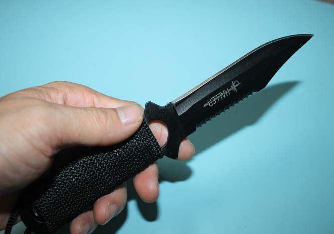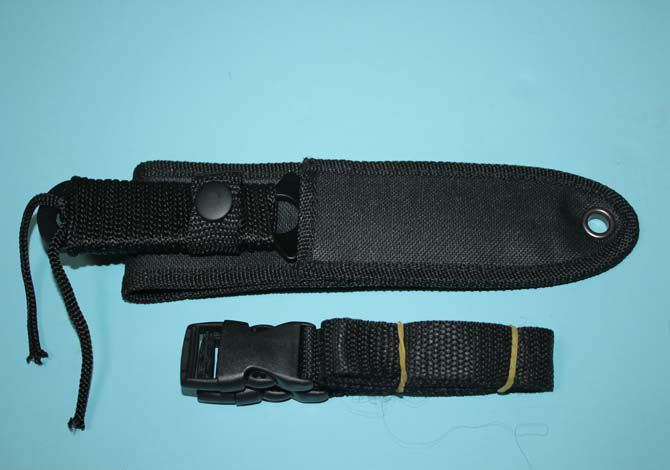 击剑带齿潜水刀(黑) 全 长:210mm 刃 长:110mm 柄 长:100mm 刃 宽:35mm 刃 厚:3.mm 刃 材:3Cr13Mov 重 量:78g(含包装) 硬 度:55HRC 表 面:发黑