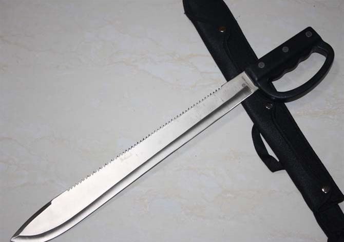 K.S.D.J野营刀(砂光版) 全长: 56CM 刃长: 43CM 刃宽: 4CM (最宽处) 刃厚: 0.33CM 硬度: 56HRC 重量: 610克(含套) 材质: 420不锈钢 涂层: 砂光版 柄材: ABS 刀鞘: 尼龙套