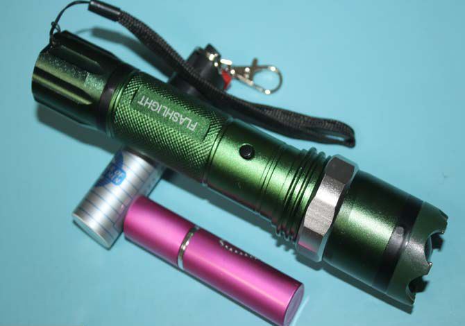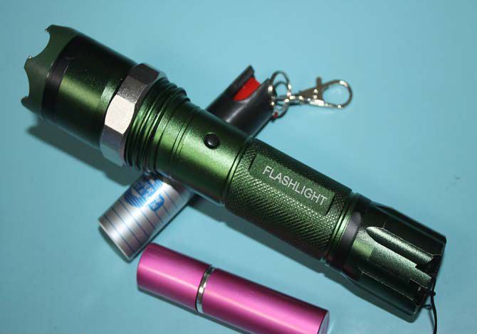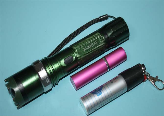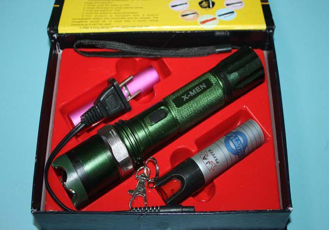 X-MEN绿色套装电棍双喷雾 全长:18.2CM 管宽:3.5CM 重量:205克 净重 输出电压:40万伏 电源方式:循环充电式 配 两支催泪喷雾