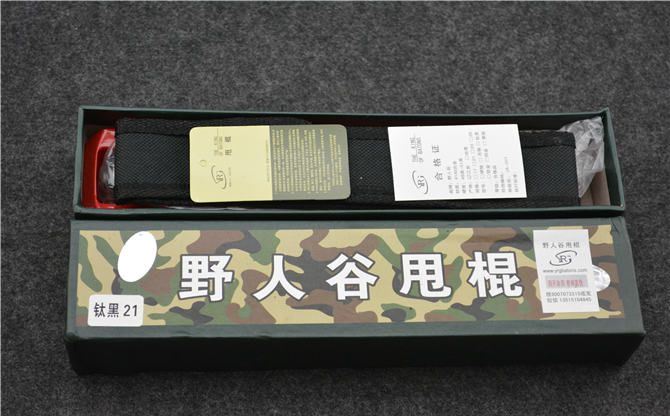 野人谷甩棍21寸(黑钛碎砖加强版) 棍体材料:高强度合金钢, 硬度大概58HRC 棍把材料:黑色乙烯基合成(防滑材质,不会因流汗潮湿而滑手) 收缩长:20 CM (便携隐蔽) 甩出长:52 CM (常用长度) 毛重:531克(含包装) 表面:硬铬银色(永不掉色) 包装:纸盒+尼龙套 其他性能:钢卡式,专门在接口处精密处理,处理后甩出锁定牢靠, 收回时,朝地面垂直一磕就回去了。