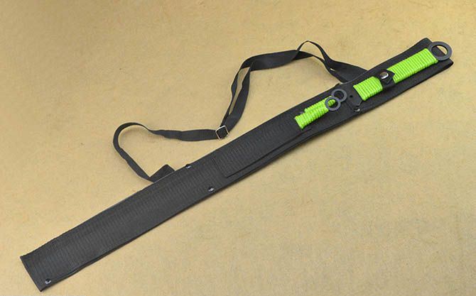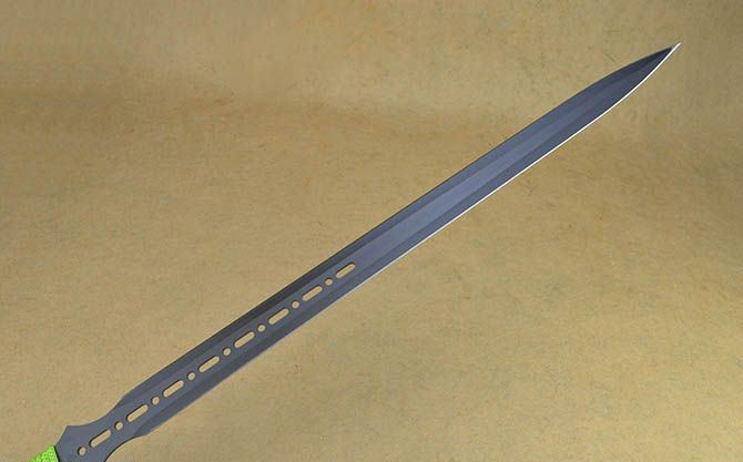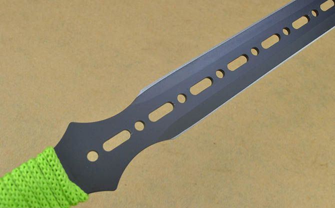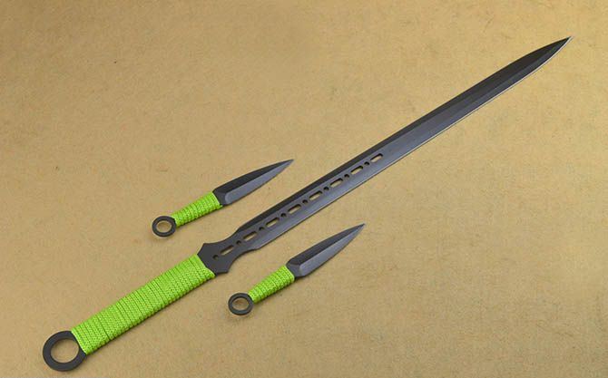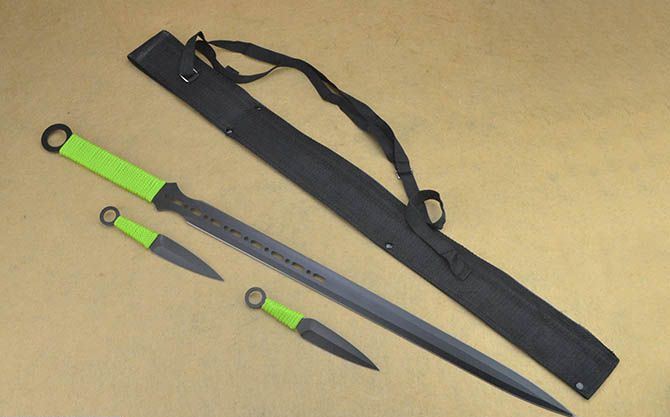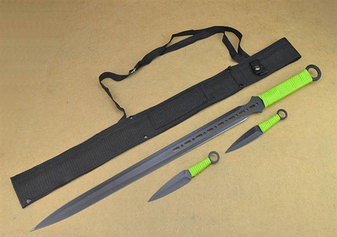 忍者刀 全长:68.5cm 刃长:47cm 刃宽:3.2cm(最宽处) 刃厚:3mm 柄长:16.5cm 表面: 发黑 刃材: 440 硬度: 56HRC 柄材: 绑绳 重量:500克(含尼龙套、飞镖) 包装:尼龙套