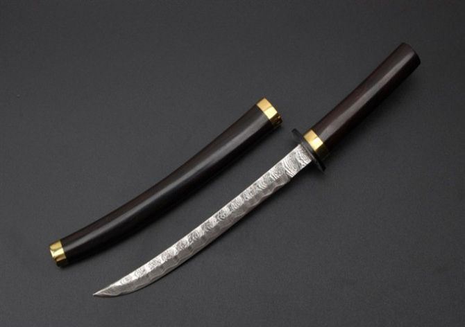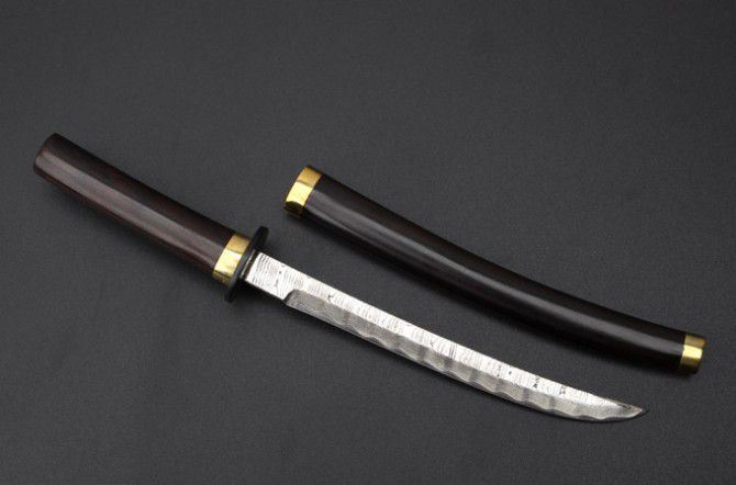 经典武士大马士革直刀(微型) 全 长: 18.5cm 刃 长: 10cm 柄 长: 7cm 硬 度: 59HRC 刃 厚: 0.24cm 重 量: 165克 刃 材: 大马士革钢 表 面: 大马士革钢特有的花纹原色 柄 材:黑檀木+铜头 配 件:刀架