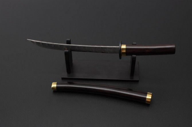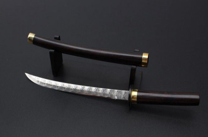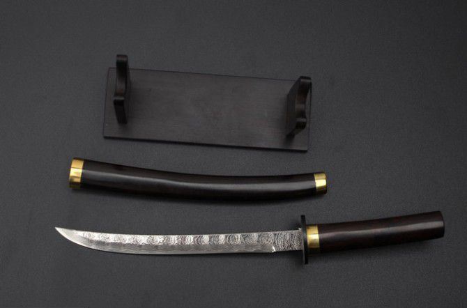 全 长: 18.5cm 刃 长: 10cm 柄 长: 7cm 硬 度: 59HRC 刃 厚: 0.24cm 重 量: 165克 刃 材: 大马士革钢 表 面: 大马士革钢特有的花纹原色 柄 材:黑檀木+铜头 配 件:刀架