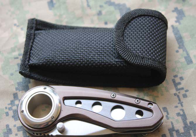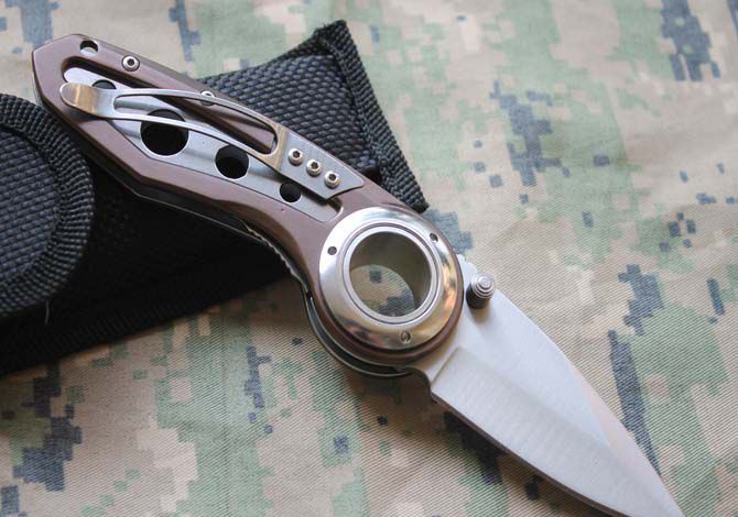 0231A折刀 刃材:5Cr13 硬度: 57HRC 全长:19CM 刃长:7.8CM 刃厚: 0.28CM 刃宽:2.8CM (最宽处) 柄长: 11.5CM 涂层:钛离子 柄材: 铝合金+钢 重量:140克 锁定: 侧锁 其它:配尼龙刀套和纸盒子