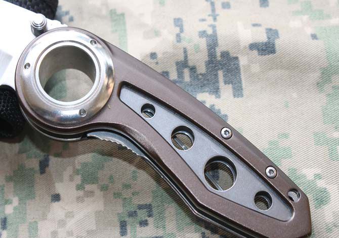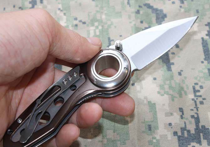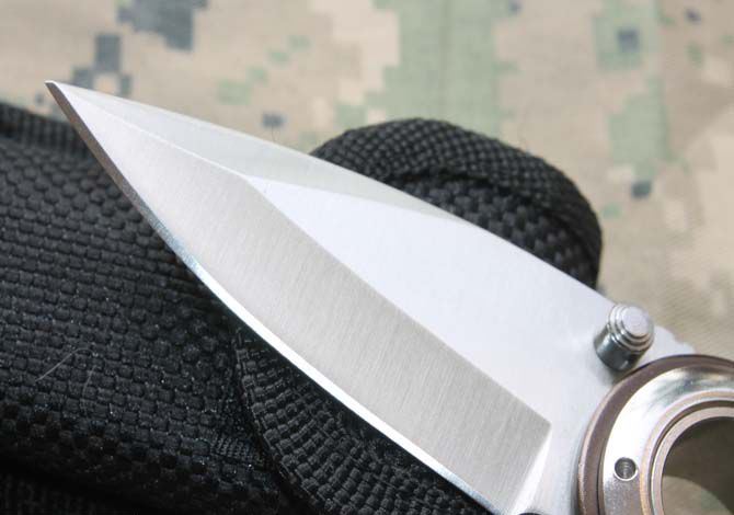 刃材:5Cr13 硬度: 57HRC 全长:19CM 刃长:7.8CM 刃厚: 0.28CM 刃宽:2.8CM (最宽处) 柄长: 11.5CM 涂层:钛离子 柄材: 铝合金+钢 重量:140克 锁定: 侧锁 其它:配尼龙刀套和纸盒子