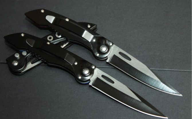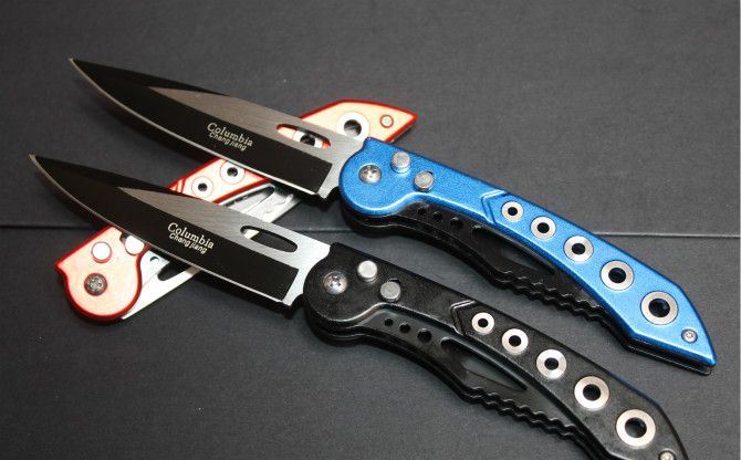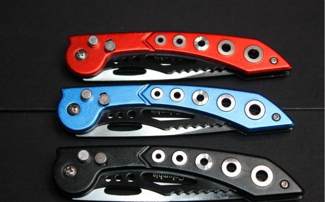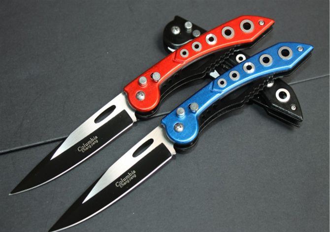强力横开822弹簧刀(红、黑、蓝) 全长:22cm 刃长:9cm 柄长:12cm 刃厚:2mm 重量:100克 表面处理:发黑 锁型:横开弹簧刀