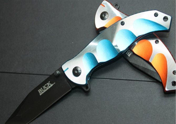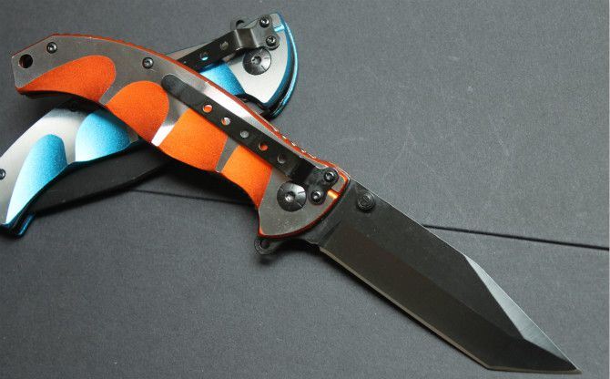 快开三指纹弹簧刀(橙、蓝) 全长:21cm 刃长:9cm 柄长:12cm 刃厚:2.5mm 重量:130克 表面处理:发黑 锁型:快开弹簧刀