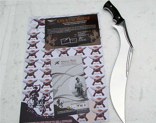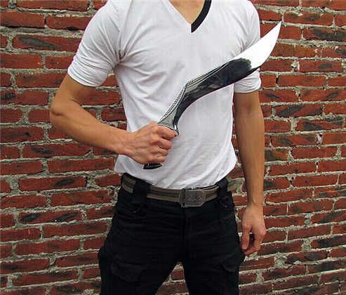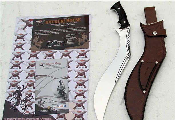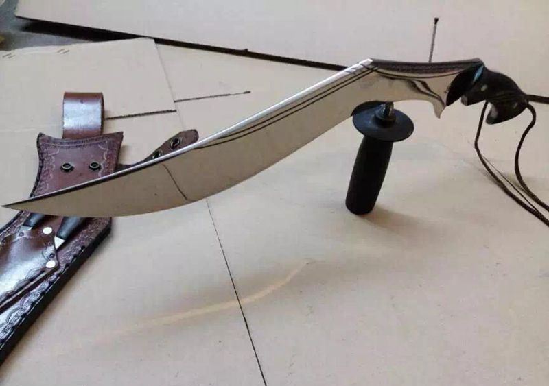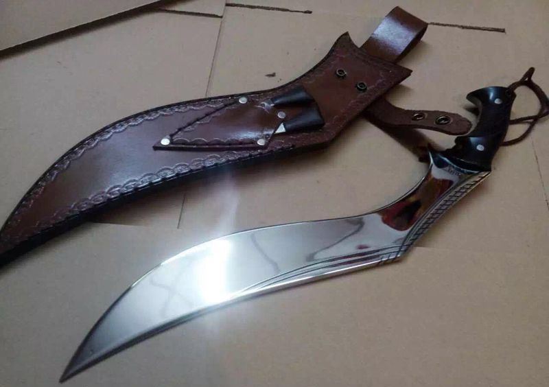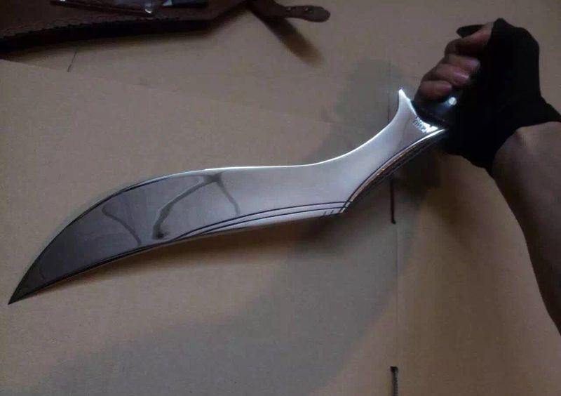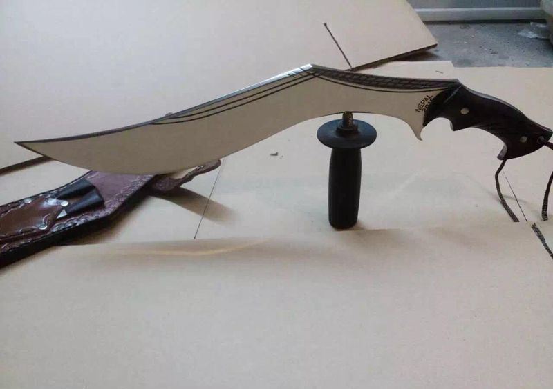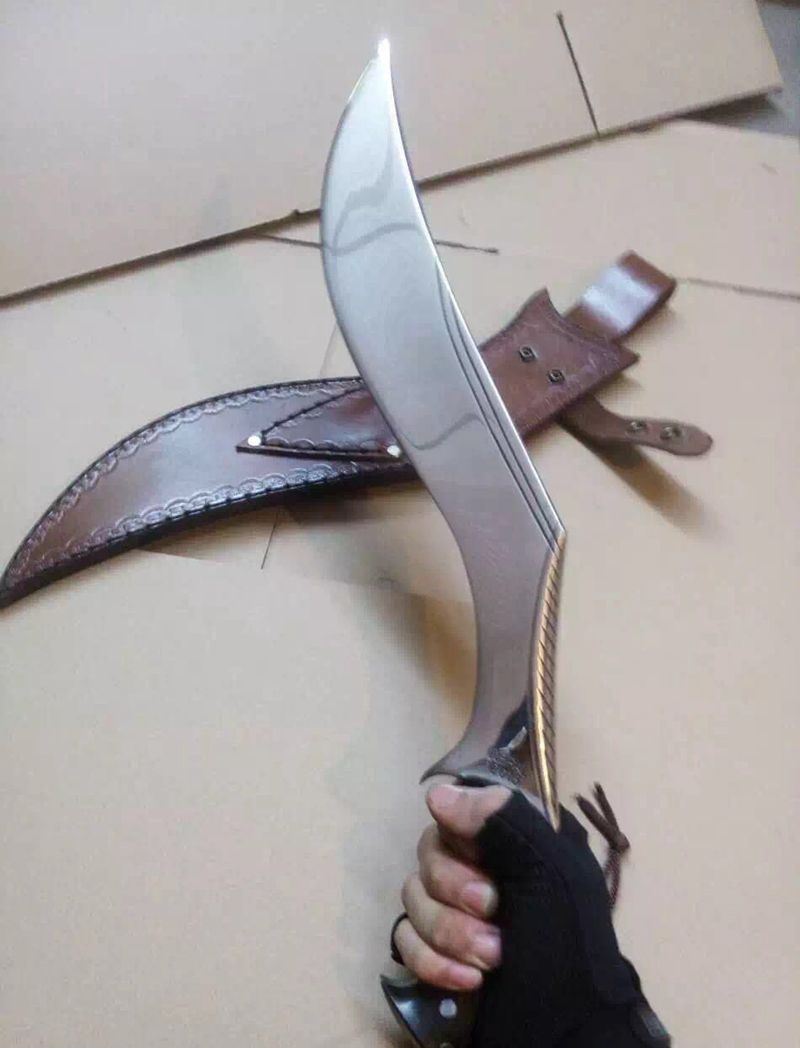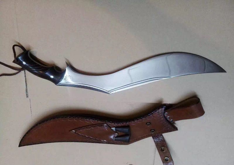 廓尔喀夜鹰新型弯刀 长度:50厘米左右 厚度:1厘米左右 宽度:5.7厘米左右 硬度:60-61左右 刃材:进口高碳钢 柄材:尼泊尔小叶紫檀 标配:头层牛皮缝合鞘一个 辅刀两个(一开刃一不开刃) 刀面处理:镜面精抛光