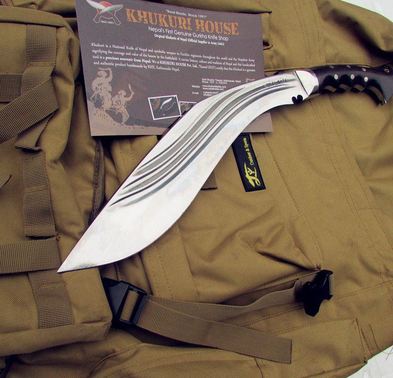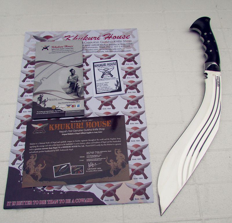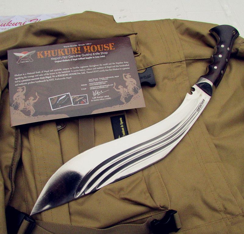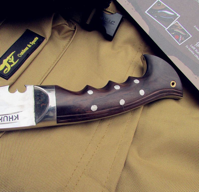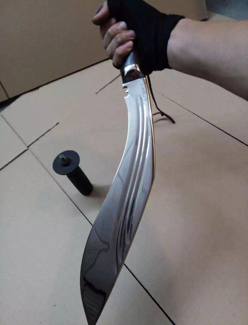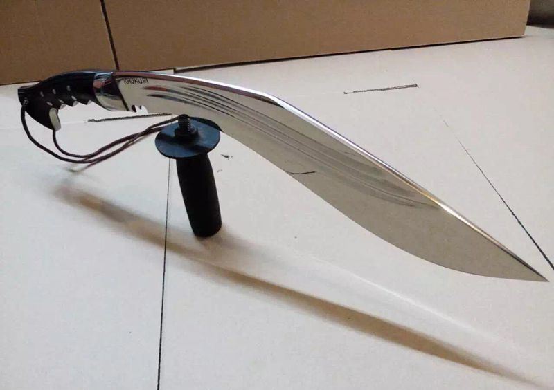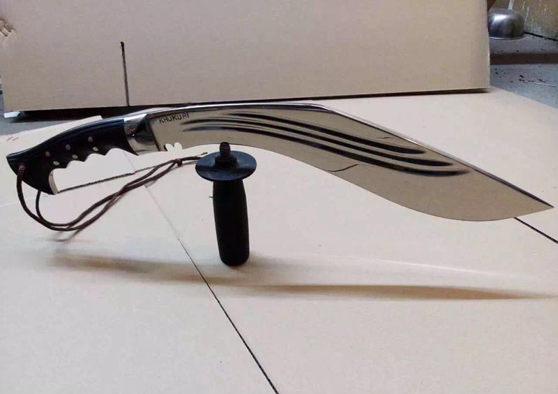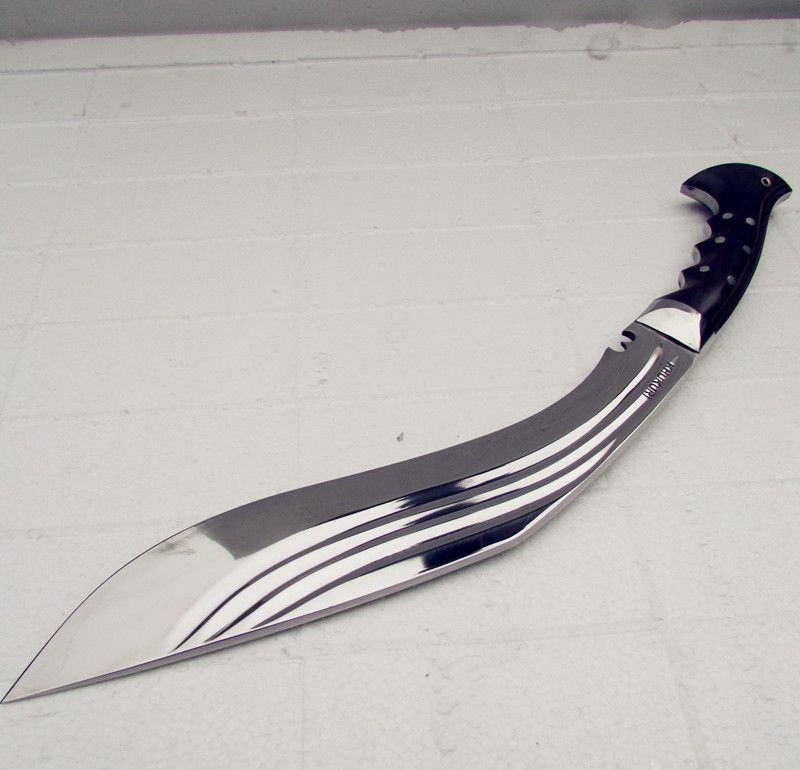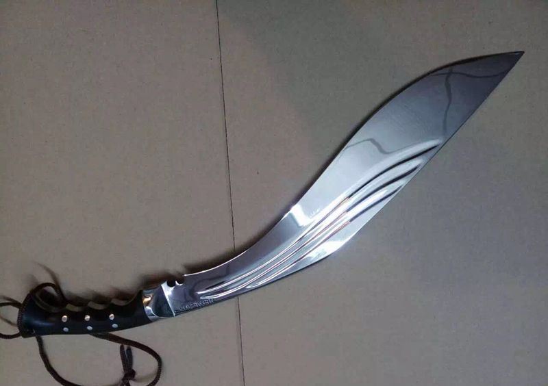 进口尼泊尔血魔弯刀 长度:51厘米左右 厚度:1厘米左右 宽度:6.2厘米左右 硬度:59-61左右 刃材:进口高碳钢 柄材:非洲小叶紫檀 标配:牛皮刀鞘一个 辅刀两把