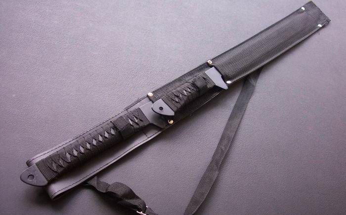 日本忍者双刀,一袋双娇!(黑版) 短刀 全长:46.6cm 刃长:29cm 厚度:0.3cm 重量:300克 长刀 全长:70.8cm 刃长:46cm 厚度:0.3cm 重量:420克 总重量:960克 刃 材:440 硬 度:56 表面处理: 电泳黑化 配战术尼龙刀鞘 刀柄用黑扎带人工绕扎而成,刀鞘可将双刀合二为一,可谓一袋双娇!