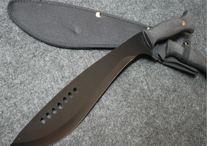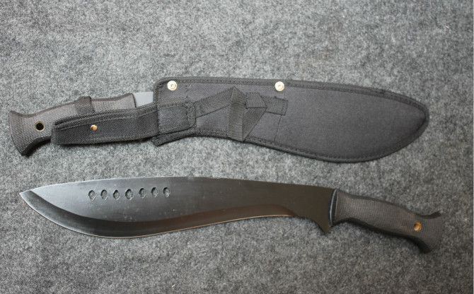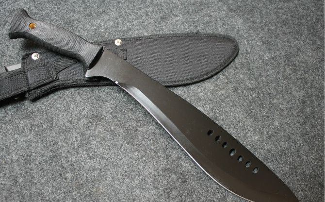 全 长:46cm 刃 长:30cm 柄 长: 12.7cm 刃 宽:6cm(最宽处) 刃 厚:3.2mm 刃 材:420 硬 度:53HRC 刀 柄:橡胶防滑棱纹柄 表 面:喷漆 重 量: 500克 附尼龙刀套