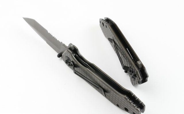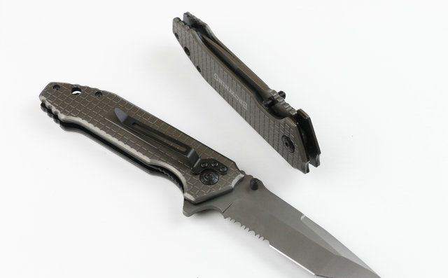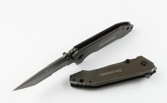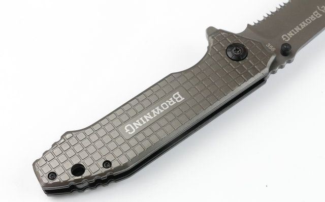 勃朗宁356快开折刀(灰钛) 刃材:5Cr13MOV 硬度: 56HRC 全长:22.1CM 刃长:9CM 刃厚: 0.34CM 刃宽:2.7CM (最宽处) 柄长: 12.6CM 涂层:镀钛 柄材: 全钢 重量:250克 锁定: 线锁快开