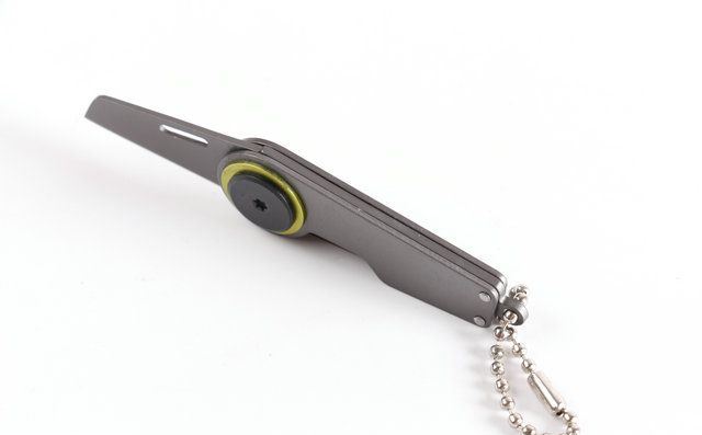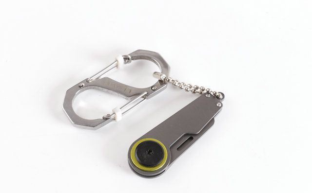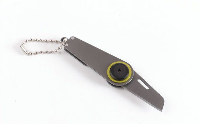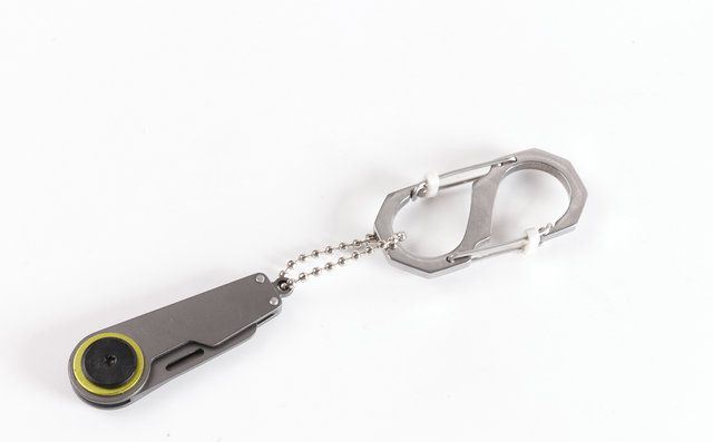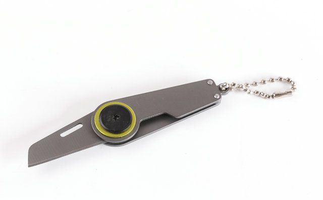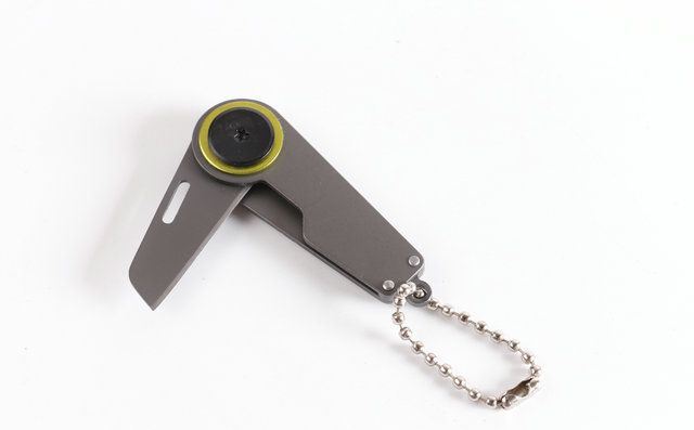 金纽扣钥匙刀 全 长:86mm 刃 长:35mm 柄 长:52mm 刃 宽:14mm 刃 厚:1.2mm 刃 材:CR13MOV 重 量:5g(含包装) 硬 度:58HRC 表 面:灰钛 柄 材:钢片 锁 型:无锁 其 他:白盒,可以扣在钥匙上