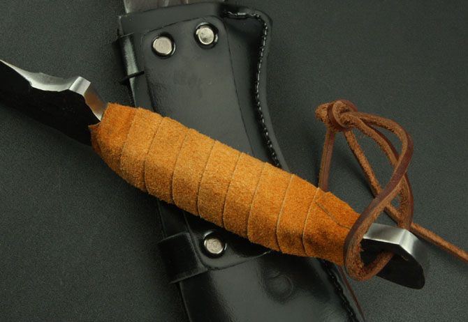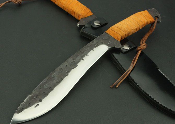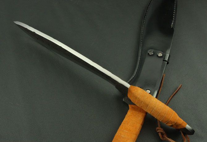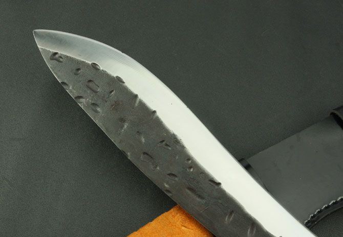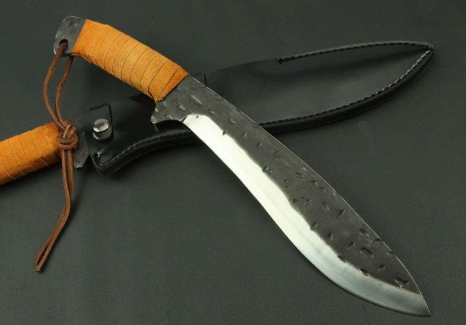 锻打小弯刀 全 长:43cm 刃 长:24cm 柄 长:13cm 刃 厚:7.5mm 刃 宽:5.2cm 净 重:860克 毛 重:960克(含包装物) 硬 度:58HRC 刃 材:碳钢 柄 材:扎皮 表面处理:钢本色