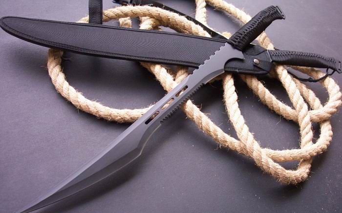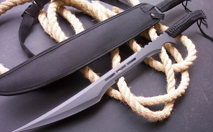 全 长: 68.8cm 刃 长: 45cm 刃 厚: 3mm 刀 宽: 4.4CM(最宽处) 材 料: 420 硬 度: 54HRC 重 量: 510g(含鞘) 表 面: 黑漆 柄 材: 一体柄,绕带 刀 鞘: 尼龙