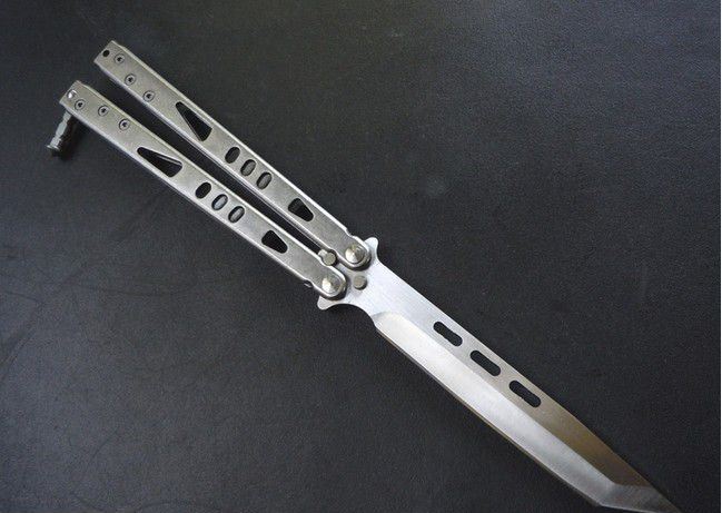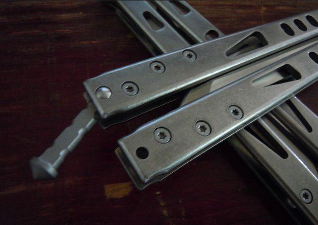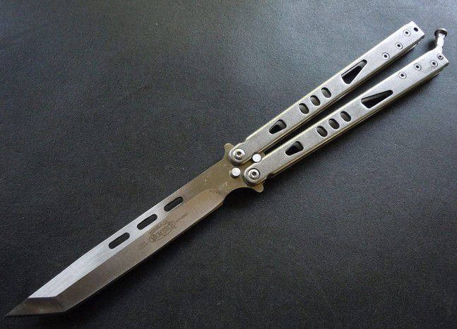 Microtech(微技术)蝴蝶甩刀-光速粒子Ⅱ TANTO头 全长:25.3 刃长:11.4 刃厚:0.38 刃材:440 柄材:石洗钢柄 柄长:13.8 重量:140克 Microtech(微技术)经典款蝴蝶甩刀-光束粒子,石洗柄,拉丝锋刃,TANTO(短刀)刃