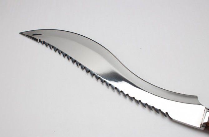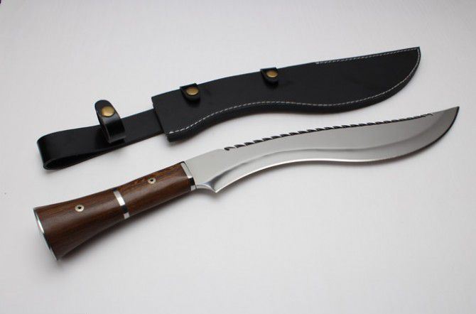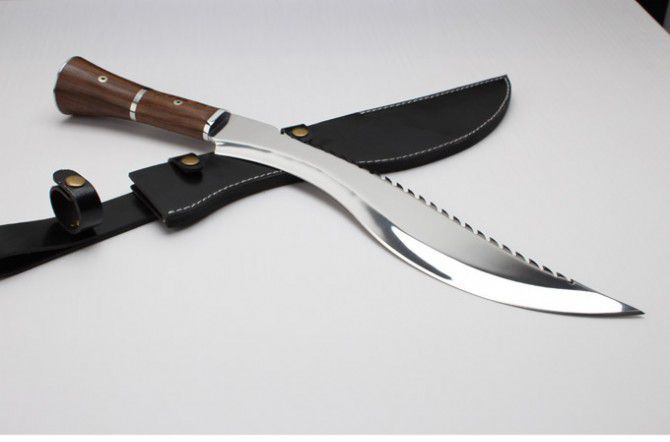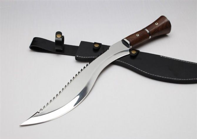 刀奴暴龙狗腿大弯刀(超镜光版) 全 长: 55.6cm 刃 长: 38.8cm 刃 厚: 5.9mm 刃 宽: 6.6cm(最宽处) 刃 材: 420 硬 度: 57HRC 刀 重: 1322克(含包装) 表 面: 超镜光 柄 材: 钢+檀木 结 构: 一体龙骨 刀 鞘: 牛皮套 +纸盒