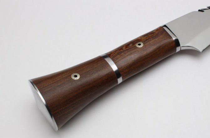 全 长: 55.6cm 刃 长: 38.8cm 刃 厚: 5.9mm 刃 宽: 6.6cm(最宽处) 刃 材: 420 硬 度: 57HRC 刀 重: 1322克(含包装) 表 面: 超镜光 柄 材: 钢+檀木 结 构: 一体龙骨 刀 鞘: 牛皮套 +纸盒
