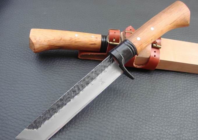 关兼常作守护刀锻钢(T头) 全长:30 刃长:16 刃厚:0.5 刃材: 喷砂锻钢 刀刃硬度: 59HRC 刀柄:原木 刀鞘:原木 +真皮+铜扣