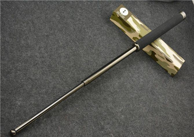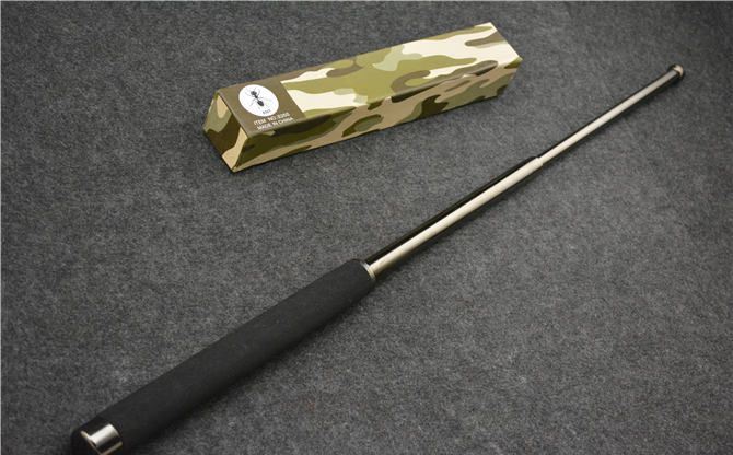 棍体材料:高强度合金钢, 硬度大概58HRC(经测试,能吊起一辆汽车以上的重量) 棍把材料:黑色乙烯基合成(防滑材质,不会因流汗潮湿而滑手) 收缩长:23.8 CM (便携隐蔽) 甩出长:62.5 CM (常用长度) 毛重:634克(含包装) 表面:硬铬黑钛 包装:纸盒+尼龙套 其他性能:钢卡式,专门在接口处精密处理,处理后甩出锁定牢靠, 收回时,朝地面垂直一磕就回去了。