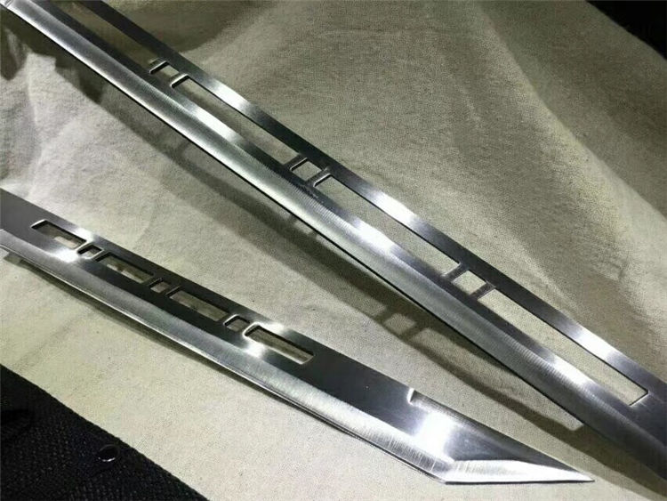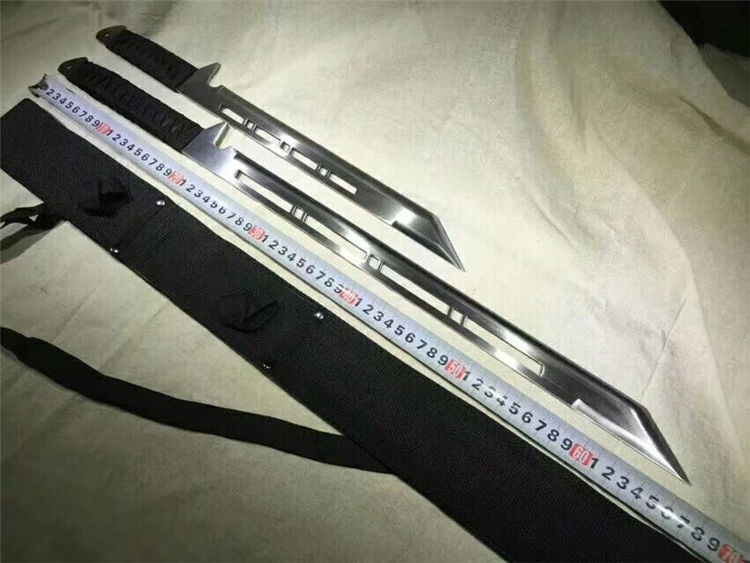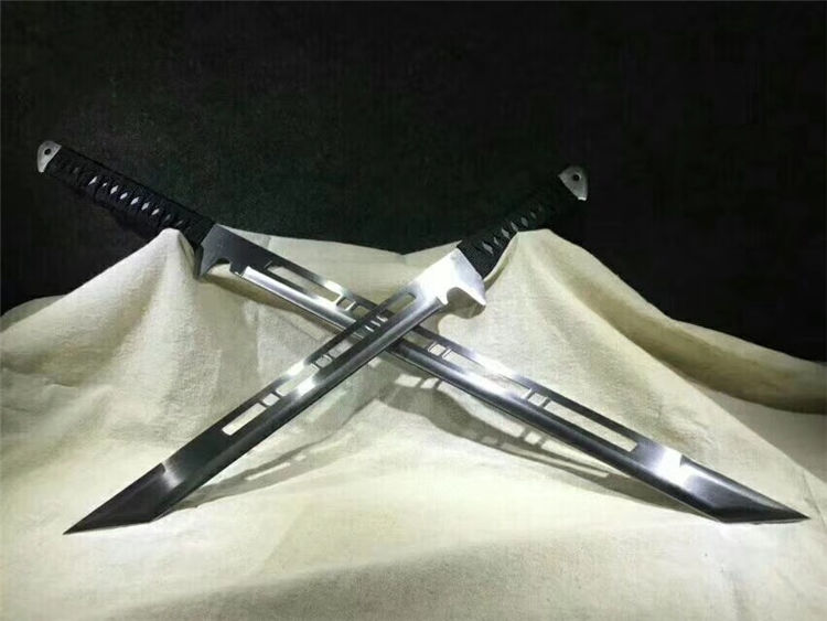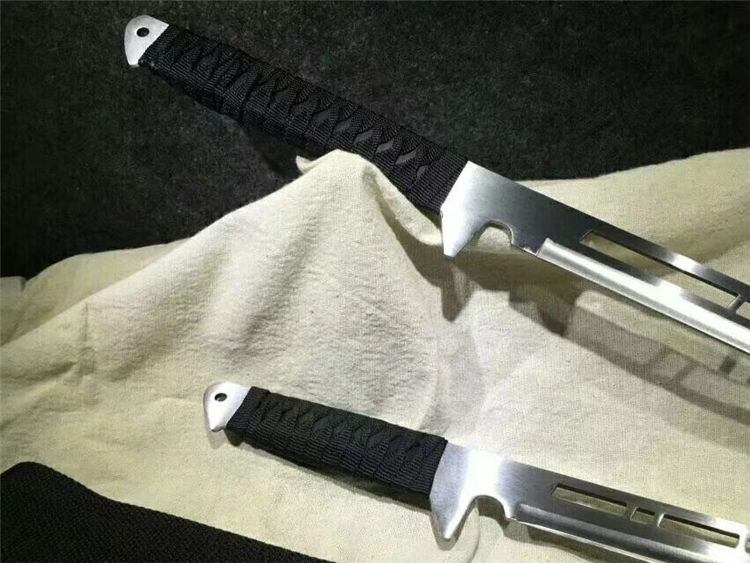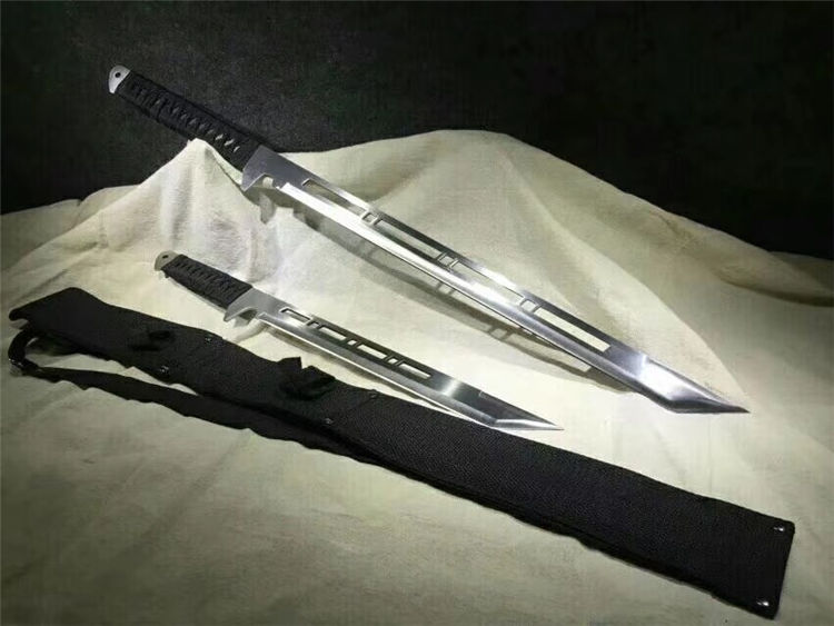 忍者双刀,一袋双娇(白版) 短刀 全长:46.5cm 刃长:30.0cm 柄长:13.0cm 厚度:0.28cm 重量:280克 长刀 全长:70.5cm 刃长:46.0cm 柄长:20.5cm 厚度:0.28cm 重量:380克 整套长:67CM 总重量:572克 刃 材:420 硬 度:56 表面处理砂光 配战术尼龙刀鞘