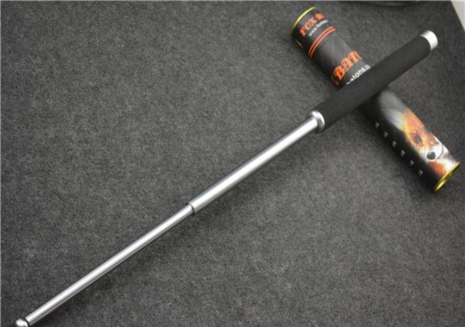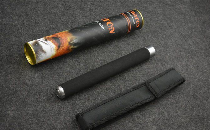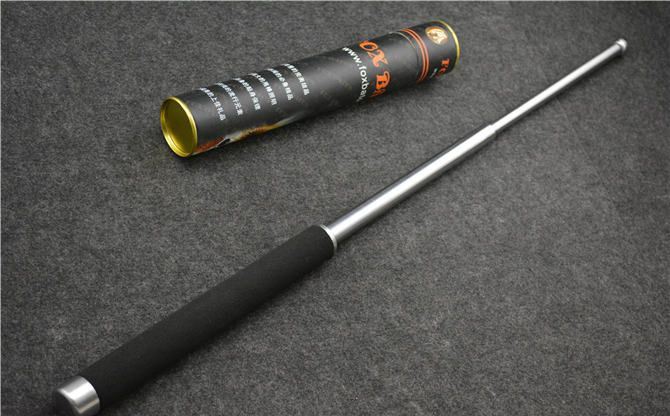 狐狸26寸甩棍(纸筒包装) 棍体材料:高强度合金钢, 硬度大概58HRC 棍把材料:黑色乙烯基合成(防滑材质,不会因流汗潮湿而滑手) 收缩长:23.8 CM (便携隐蔽) 甩出长:62.5 CM (常用长度) 毛重:634克(含包装) 表面:硬铬银色(永不掉色) 包装:纸盒+尼龙套 其他性能:钢卡式,专门在接口处精密处理,处理后甩出锁定牢靠, 收回时,朝地面垂直一磕就回去了。