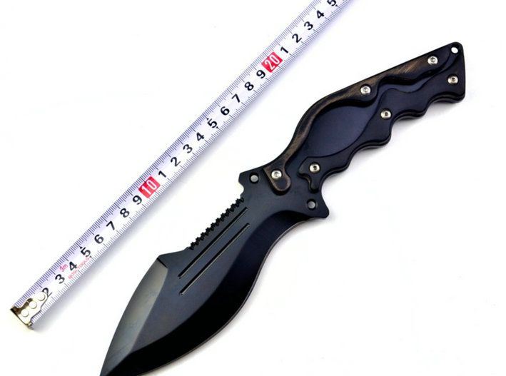 全长:28cm 刃长:14.5cm 柄长:13.5cm 柄材:黑檀木 净重:250g 刃厚:4mm 刃材:440 硬度:57Hrc 表面:黑氧化 刀套:牛津刀套