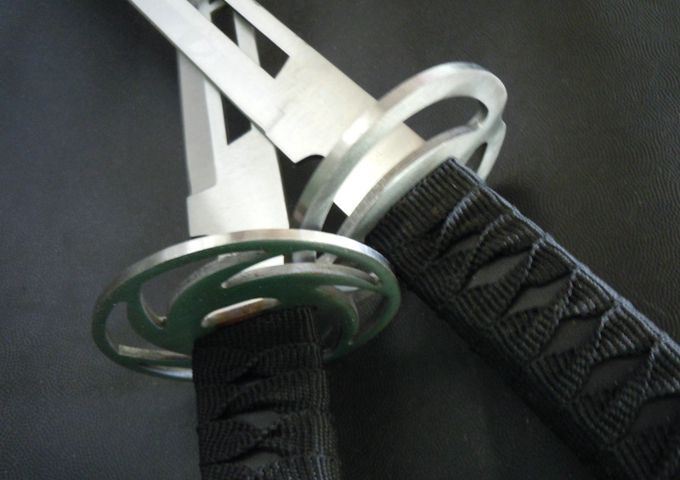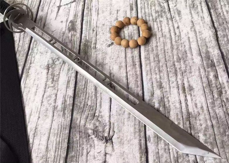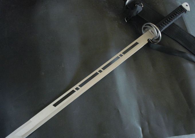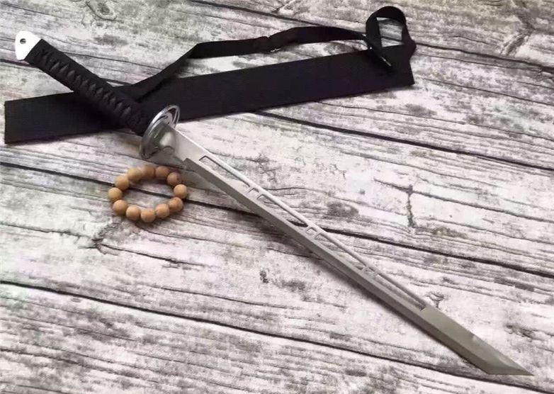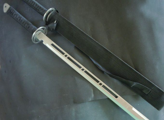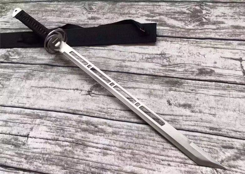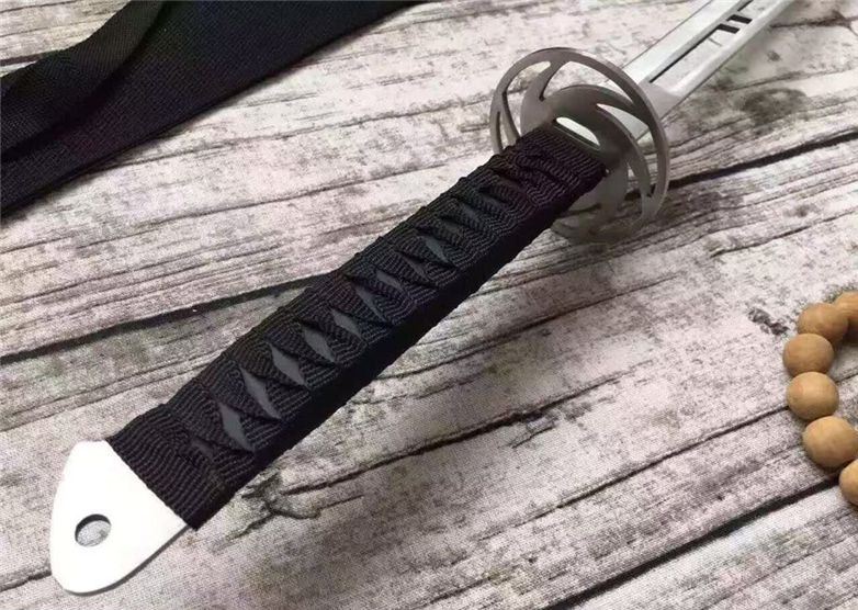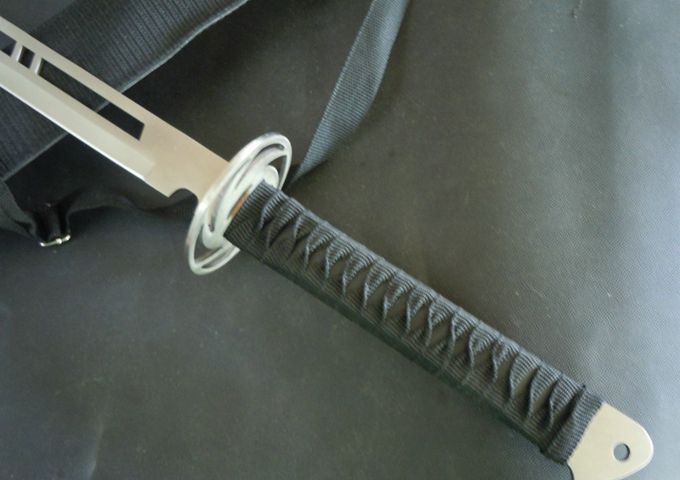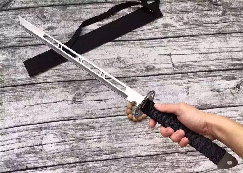 全 长: 71.5cm 刃 长: 50cm 刃 厚: 3mm 材 料: 420不锈钢 硬 度: 54-56HRC 重 量: 375g(含尼龙套) 表 面: 黑漆 柄 材: 全钢柄,绑绳 刀 鞘: 尼龙 忍者长刀系列,窄刃圆盘挡手,镂空刃