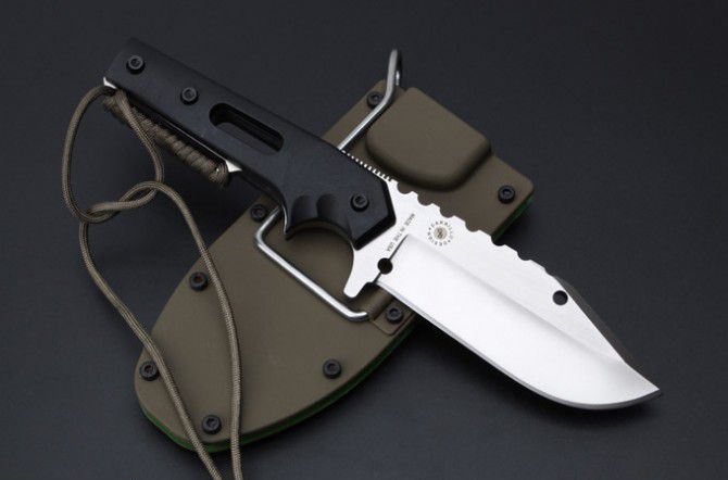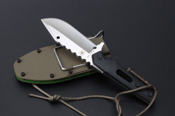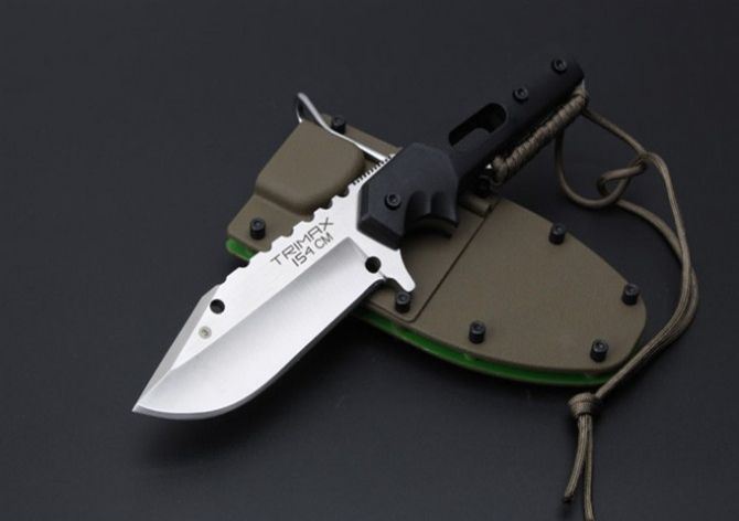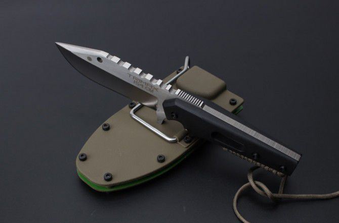 三角洲反恐专家 材质:440 全长:250cm 刃长:12.2cm 刃厚:0.65cm 刃宽: 4.3cm 刀重量: 633克(含包装) 表面:砂光拉丝 硬度:57HRC(真空热处理) 刀鞘:双色ABS