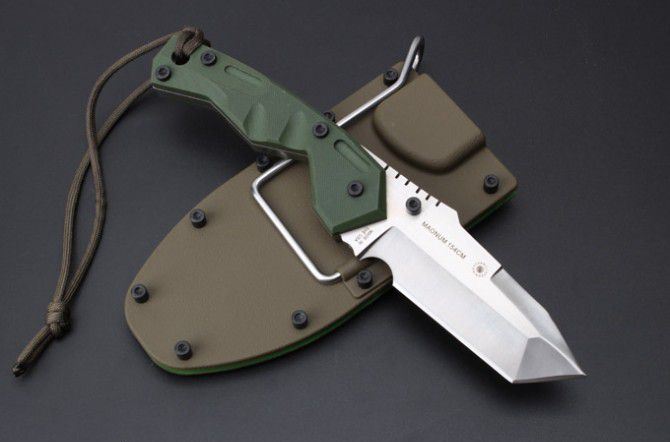 科帝多探险救援刀 材质:440 全长:230cm 刃长:11.5cm 刃厚:0.65cm 刃宽: 4.1cm 刀重量: 656克(,含包装) 表面:砂光拉丝 硬度:57HRC(真空热处理) 刀鞘:双色ABS