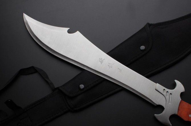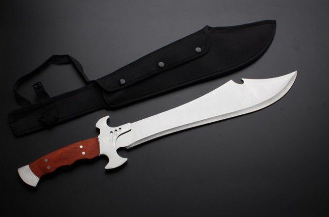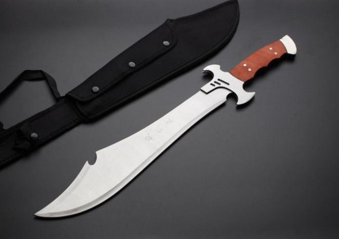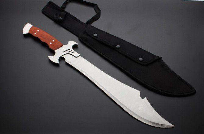 全 长:50.5cm 刃 长:34.2cm 柄 长: 15.5cm 刃 宽:7.1cm(最宽处) 刃 厚:2.8mm 刃 材:440 硬 度:56HRC 刀 柄:彩木 刀 鞘:加厚防皮刀套 表 面:砂光 结 构:龙骨结构,刀身贯穿刀柄,到末端再用铆钉固定,非常牢固。 重 量: 488克(含刀套)