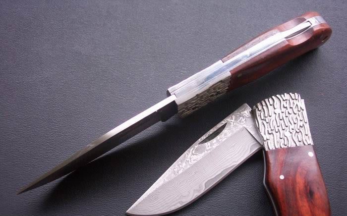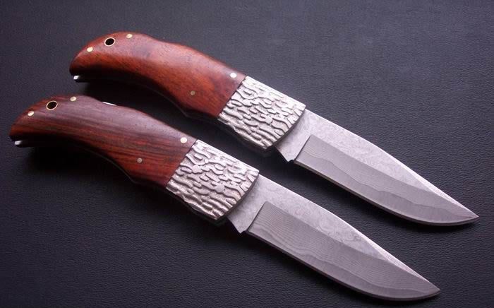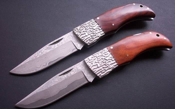 钢雕大马士革收藏折刀 全 长: 20cm 刃 长: 8cm 刃 厚: 3mm 刃 材: 进口大马士革钢 硬 度: 58HRC 重 量: 160g 表 面: 花纹原色 柄 材: 桃木+雕花钢头 锁 闭: 背锁 (不带皮套, 配尼龙刀套)