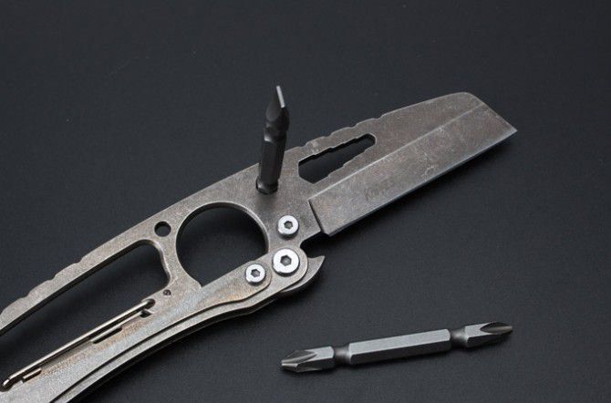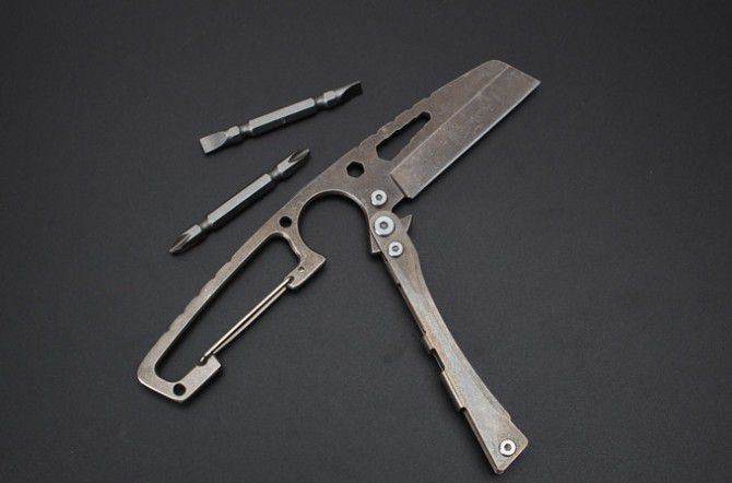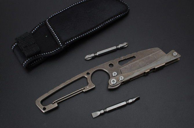 SR-S033E多用工具刀 全 长:188mm 刃 长:70mm 柄 长:11mm 刃 宽:28mm 刃 厚:2.5mm 刃 材:7Cr17Mov 重 量:58g(含包装) 硬 度:57HRC 表 面:古铜 柄 材:钢柄 其 他:配彩盒+两支螺丝刀