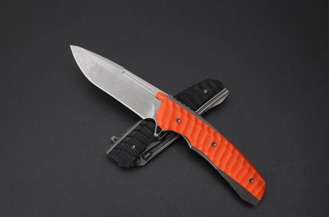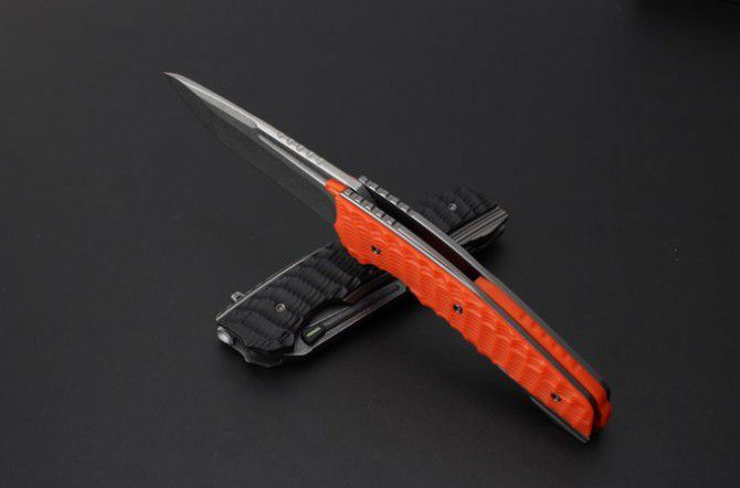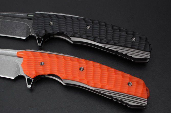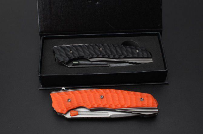 俄罗斯蟒蛇(手工版)橙色柄、黑色柄 全长:219mm 刃长:90mm 柄长:123mm 刀片材料:9Cr18MoV 叶片处理:本色石洗/发黑石洗 柄材:不锈钢(CNC加工完成)+ABS(黑色,橙色) 系统:采用平面轴承 硬度:58-60(真空热处理) 备注:叶片装饰和皮带夹各有一条荧光棒,第一次使用需要采用电筒光或阳光照射