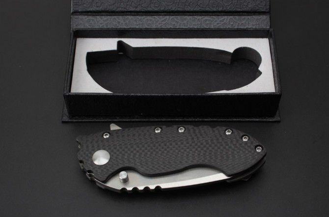 全长:215mm 刃长:82mm 柄长:130mm 刃宽:38mm 刃厚:4.9mm 刃材:D2 重量:220克 硬度:60HRC 表面:石洗 处理材料:碳纤+ TC4钛合金 包装:黑色盒子