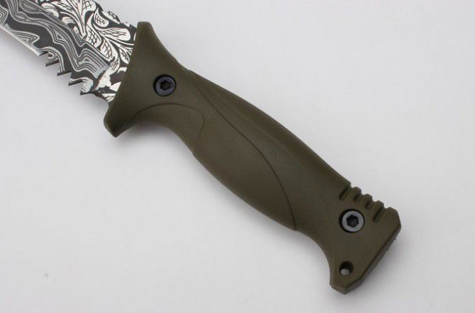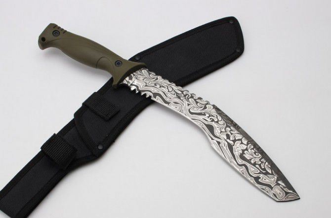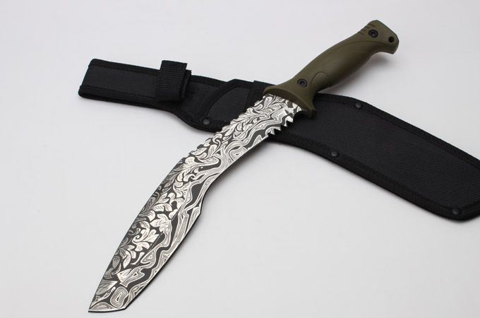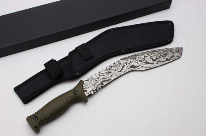 全 长:40.5mm 刃 长:270mm 柄 长:145mm 刃 宽:4.7mm 刃 厚:6.0mm 刃 材:5Cr13Mov 重 量:881g(含包装) 硬 度:57HRC 表 面:雕花 柄 材:ABS 锁 型:定锁 其 他:配尼套和硬纸盒