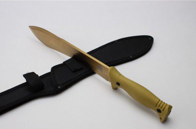 全 长:40.5mm 刃 长:270mm 柄 长:145mm 刃 宽:50mm 刃 厚:6.0mm 刃 材:7Cr17Mov 重 量:877g(含包装) 硬 度:57HRC 表 面:镀钛金 柄 材:ABS 锁 型:定锁 其 他:配尼套和硬纸盒