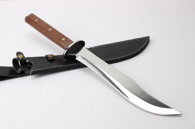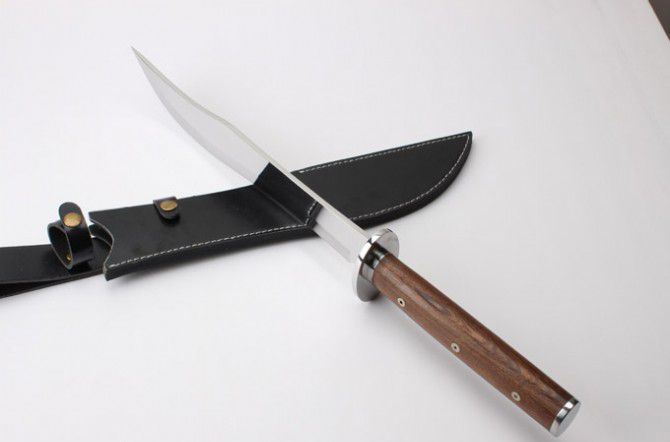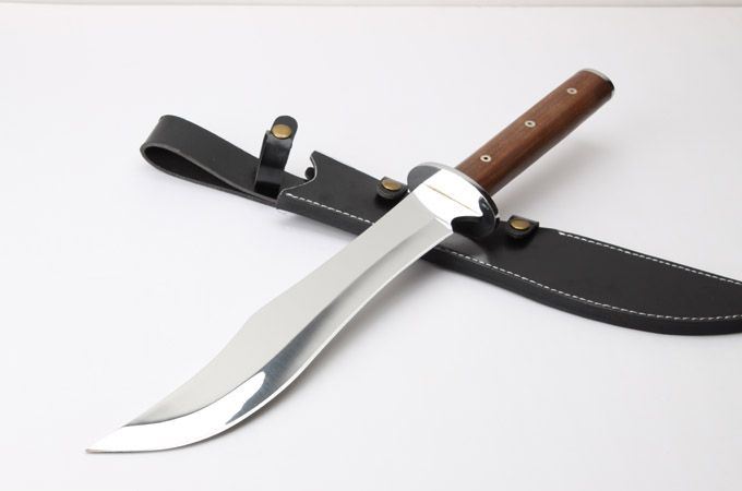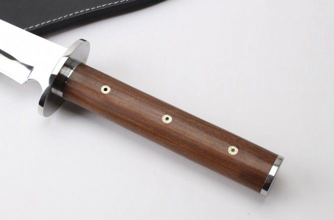 全 长: 57.6cm 刃 长: 36.3cm 柄 长: 21.2cm 刃 厚: 5.5mm 刃 宽: 5.6cm(最宽处) 刃 材: 420 硬 度: 57HRC 刀 重: 1399克(含包装) 表 面: 超镜光 柄 材: 钢+檀木 结 构: 一体龙骨 刀 鞘: 牛皮套 +纸盒