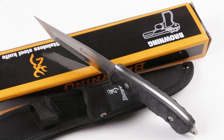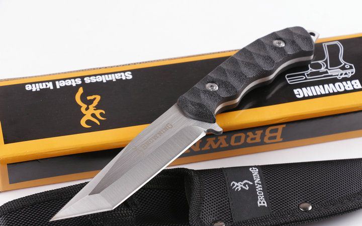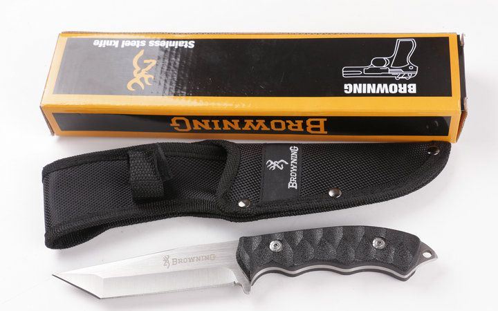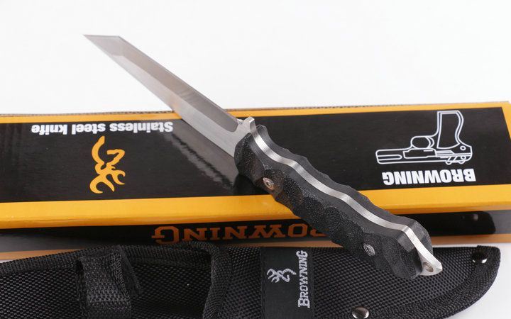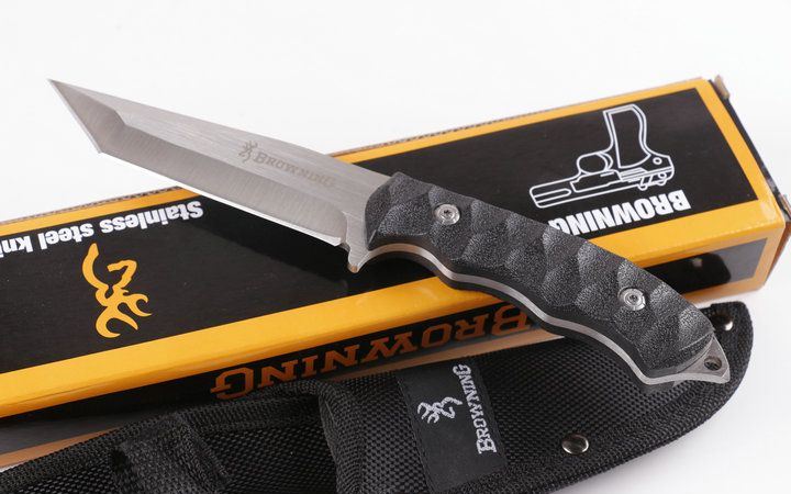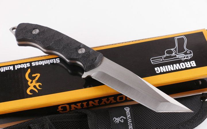 勃朗宁小精英直刀(T头) 全 长:22.8cm 刃 长:11.2cm 柄 长:11.6cm 刃 宽:2.8cm(最宽处) 刃 厚:3.6mm 刃 材:5crMov15 硬 度; 58HRC 刀 柄:ABS 表 面:沙光 结 构:一体龙骨,玻璃撞击器 重 量:250.0克 备 注:带尼龙套