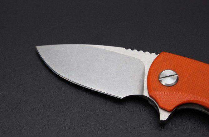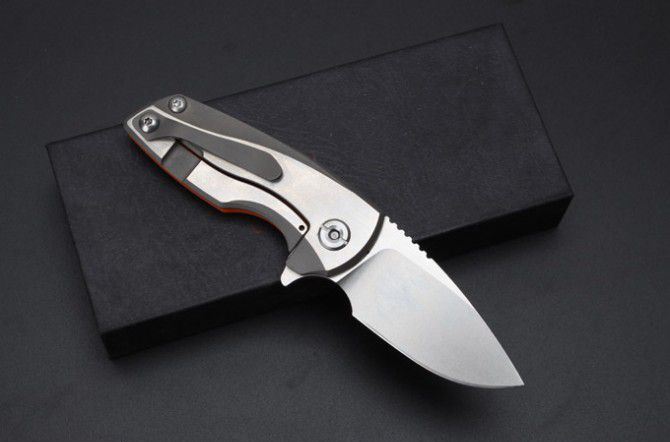 肥仔高端折刀(橘红柄) 总体长:15.3mm 叶片长度:6.3mm 封闭长度:90毫米 叶片厚度:3.8mm 刀片表面处理:全手工打磨 重量:157克(含包装) 叶片材料:D2 处理材料:钛 硬度:58-60HRC 表面:石洗 最新的拔手钉快开方式,开合更加顺畅,钛+G10刀柄.刀片采用D2材料,全手工打磨,线条流畅;最高要求的精准的外六角止位钉,更显工艺高超;内嵚式合金锁位片,使刀柄表面光滑,给人最美观感!