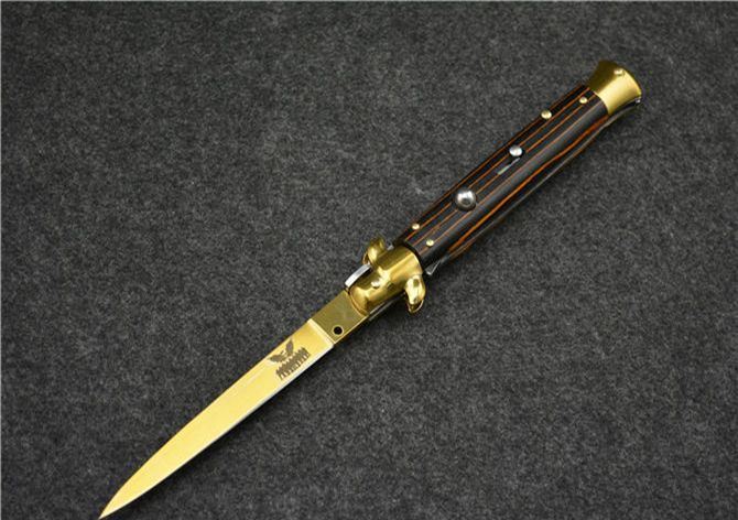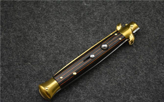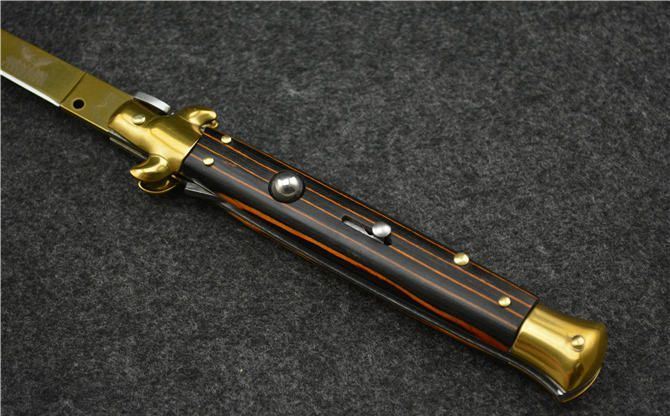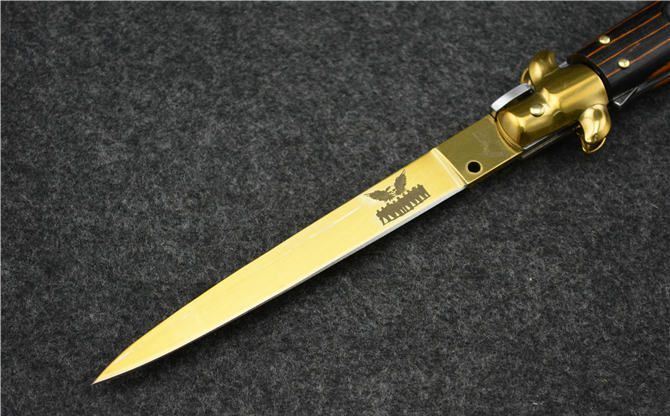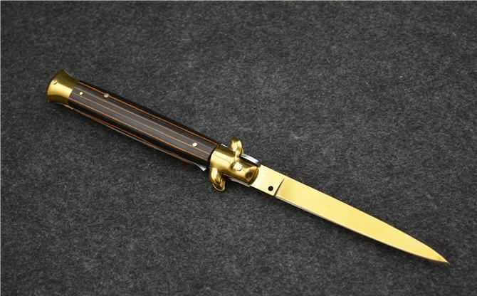 11寸意大利AKC古典跳刀黑手枪刺刃(金刃条纹彩木柄) 全 长:27.5cm 刃 长:12.5cm 柄 长:15.5cm 刃 宽:1.3cm(最宽处) 刃 厚:3.0mm 刃 材:9铬18钼钒 刀 柄:彩木 表 面:镀金镜光 开刀方式:弹簧 重 量:147克 220(毛重) 包装:彩盒