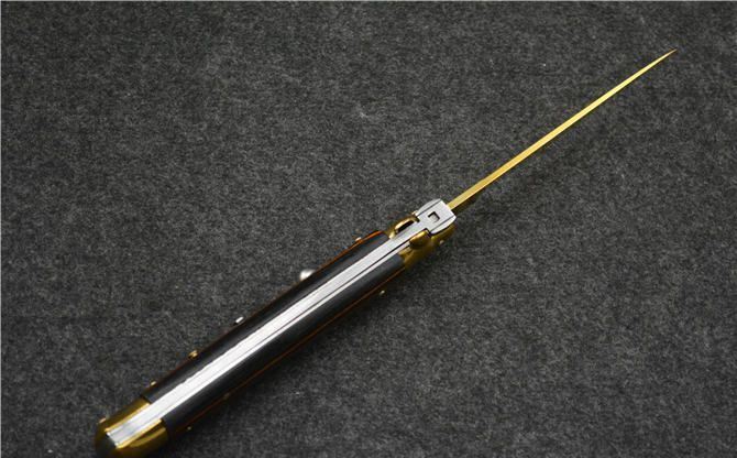 全 长:27.5cm 刃 长:12.5cm 柄 长:15.5cm 刃 宽:1.3cm(最宽处) 刃 厚:3.0mm 刃 材:9铬18钼钒 刀 柄:彩木 表 面:镀金镜光 开刀方式:弹簧 重 量:147克 220(毛重) 包装:彩盒