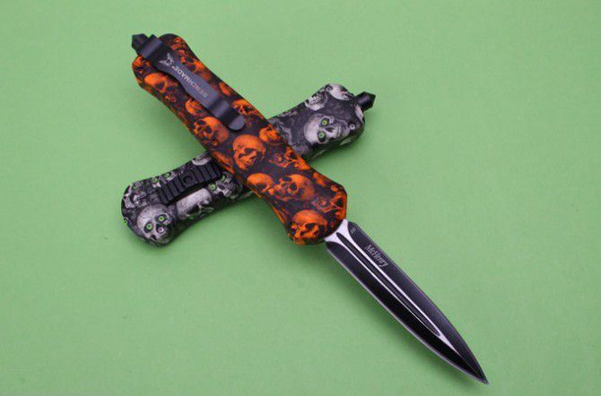 A020蝴蝶刀(火焰邪神)(橙色、白色、绿色、红色) 全 长: 22.9cm 刃 长: 9.6cm 刃 厚: 1.8mm 刃 材: 440 硬 度: 57HRC 刀 重: 200g 毛 重: 276g 表 面: 柄材 迷彩钢: 锌铝合金 刀 鞘: 尼龙 锁 闭:直出弹簧刀 注 意:购买的时候请注明是要什么颜色刀柄的。