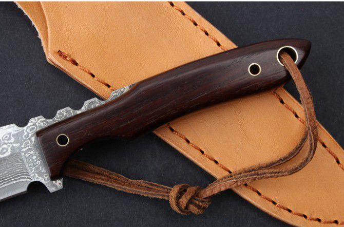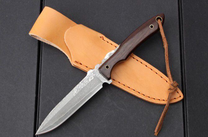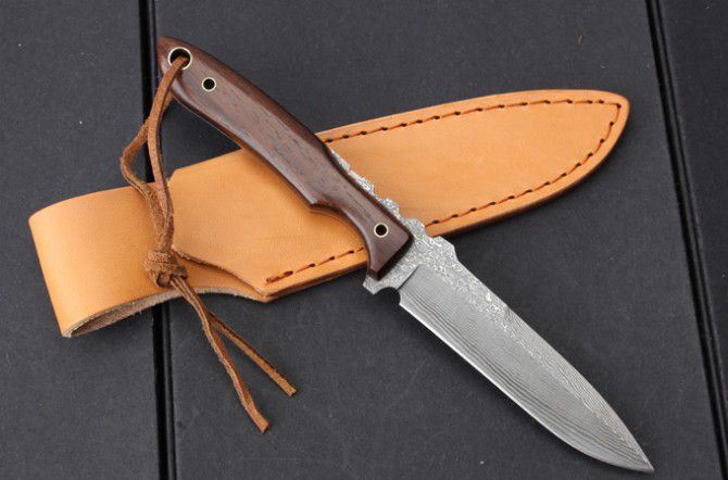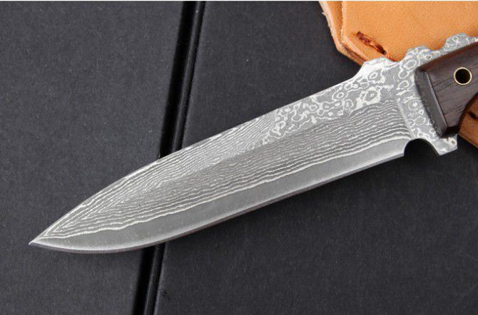 大马士革浴血酸枝木直刀 全 长: 19.5cm 刃 长: 9.8cm 柄 长: 9.7cm 刃 宽: 2.1cm(最宽处) 硬 度: 58HRC 刃 厚: 0.30cm 柄 材: 酸枝木 重 量: 108克(含包装) 刃 材: 进口一体钢 大马士革钢 表 面: 大马士革钢特有的花纹原色 其 他: 刃口锋利,真皮套 大马士革钢花纹和把手木纹及颜色各异,以实物为准!
