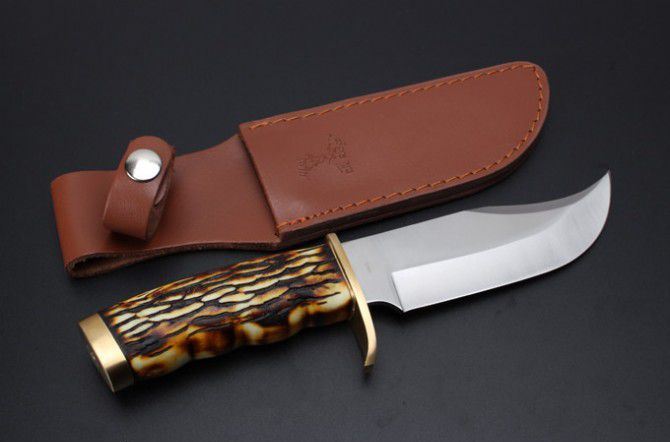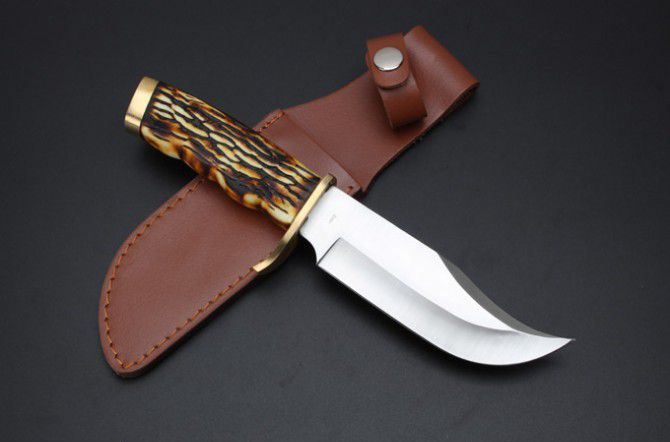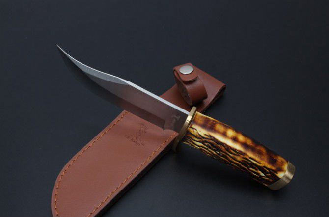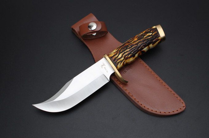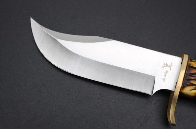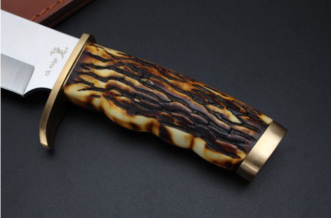 美国ELK Ridge麋鹿狩猎刀(代工版) 全 长:250mm 刃 长:135mm 柄 长:115mm 刃 宽:37mm 刃 厚:3.8mm 刃 材:7Cr17Mov 硬 度:58-59HRC 表 面:手工砂光 柄 材:仿骨+纯铜 重 量:305克 总 重:390克 其 他:配真皮套和纸盒