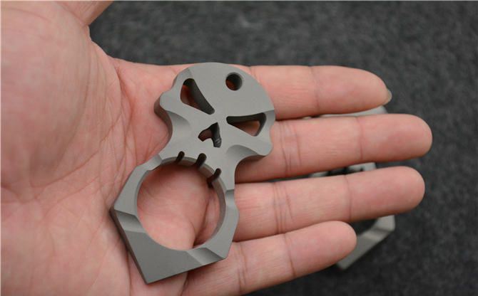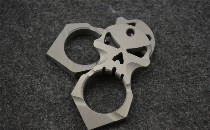 钛金骷髅手刺 长:75mm 宽:35mm 厚:9.5mm 重量:60g 采用高强度tc4钛合金,经精光切割,然后手工打磨成型,平时是个性挂饰,在危急时可扣于中指,用于击碎车窗玻璃得以逃生。6铝4钒钛合金,国内标号tc4,一般用于战机引擎骨架乃至航天飞机的主要结构,硬度高达hrc46,尖部经过热处理硬度更高